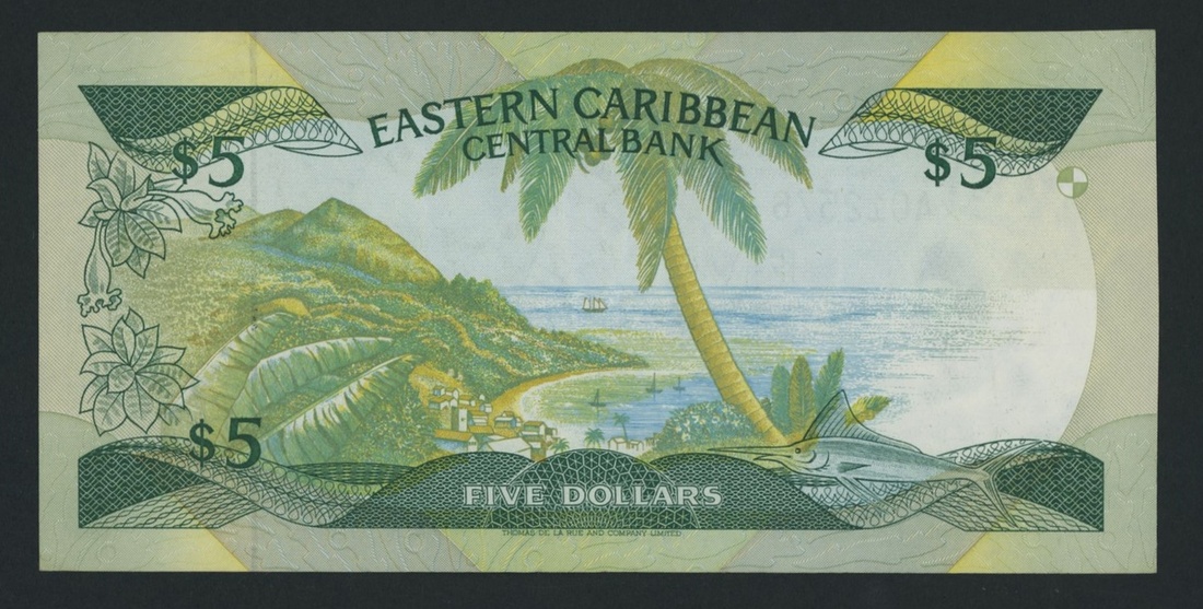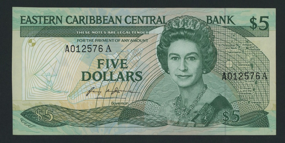 Eastern Caribbean Central Bank, East Caribbean States / Antigua, 5 Dollars, ND (1986-88), serial number A012576A, (Pick 18a), Extremely Fine