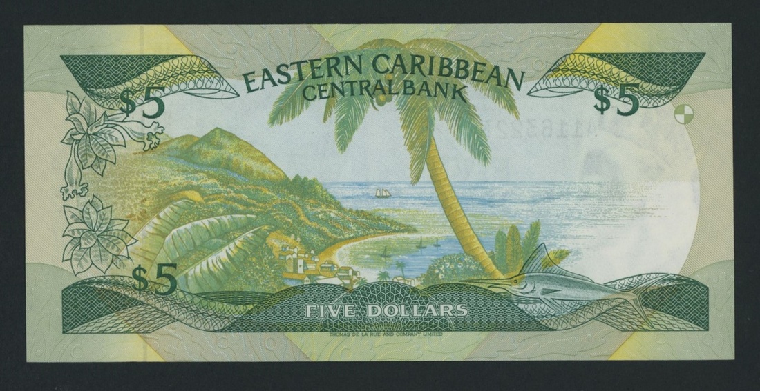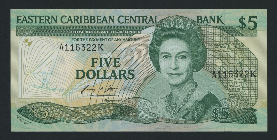 Eastern Caribbean Central Bank, East Caribbean States / St Kitts, 5 Dollars, ND (1986-88), serial number A116322K, (Pick 18k), About Uncirculated