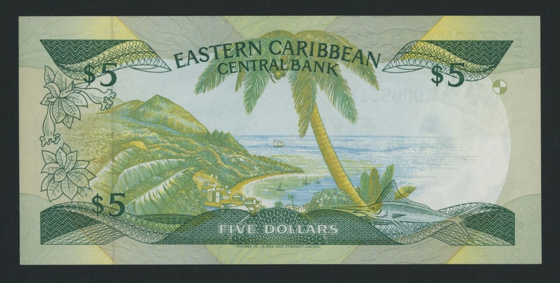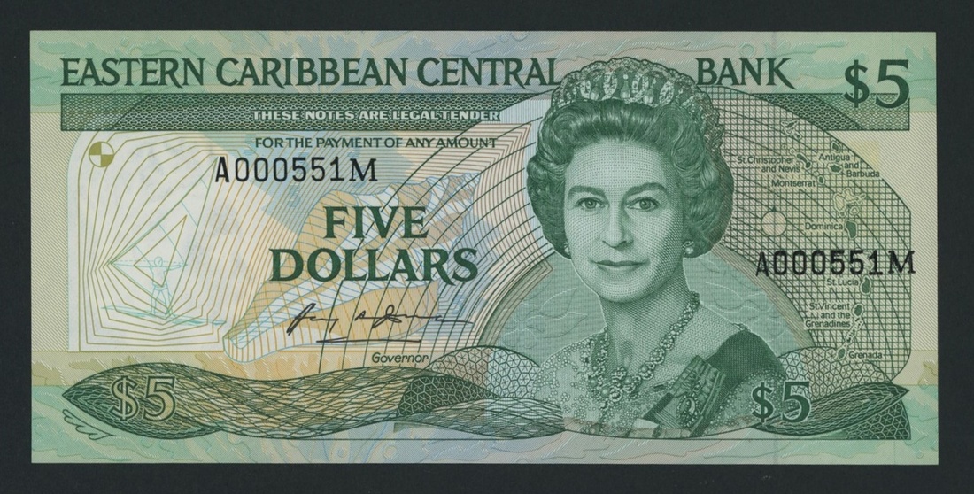Eastern Caribbean Central Bank, East Caribbean States / Montserrat, 5 Dollars, ND (1986-88), Low serial number A000551M, (Pick 18m), Uncirculated