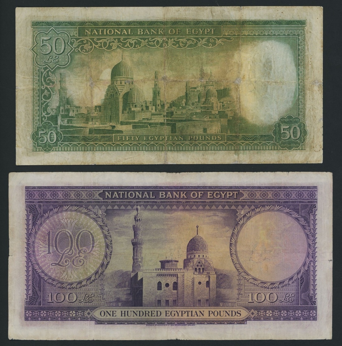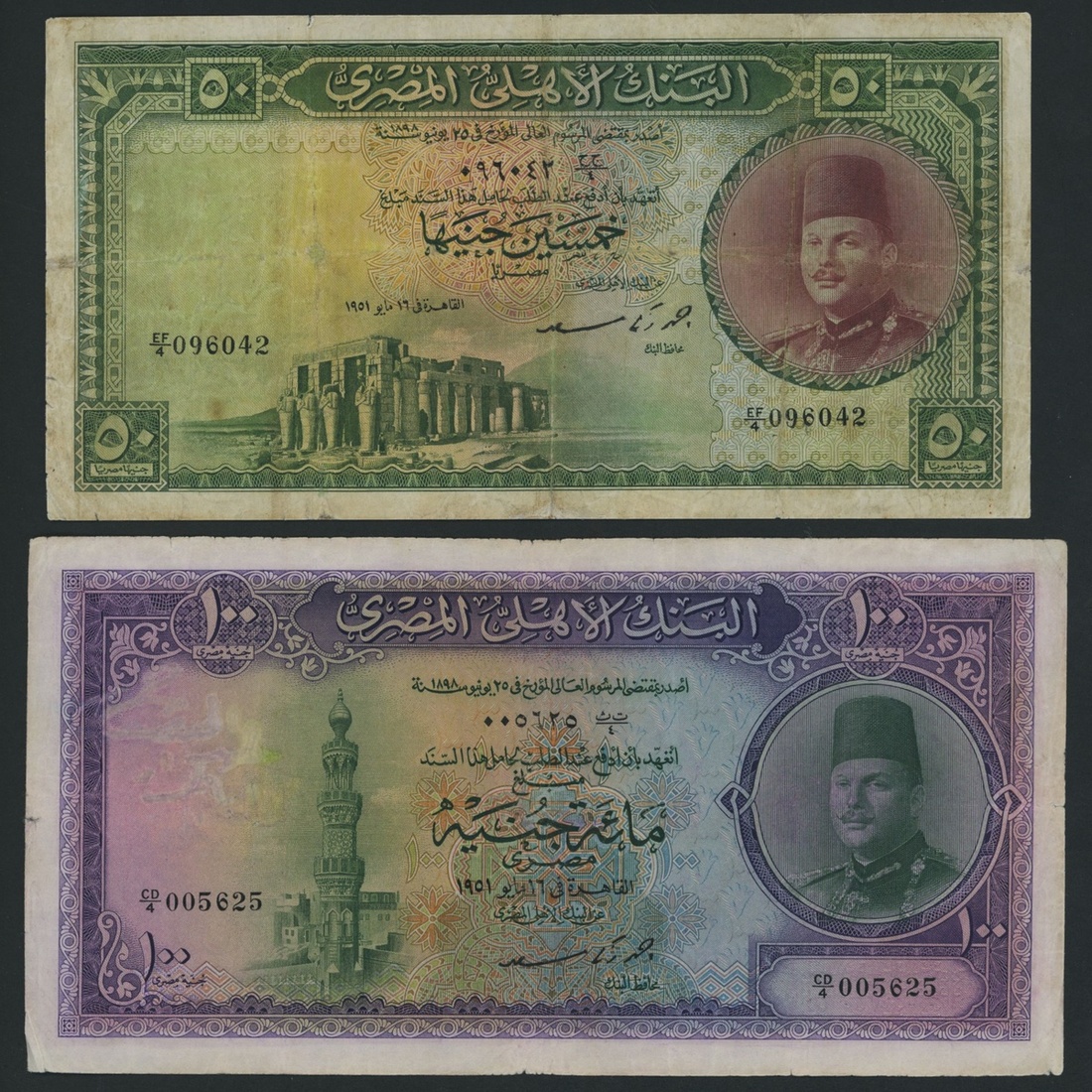 (x) [2 notes] National Bank of Egypt, £50 & £100, 1951, serial numbers EF/4 096042, CD/4 005625, (Pick 26, 27), some centre fold and minor tears around borders, otherwise good fine