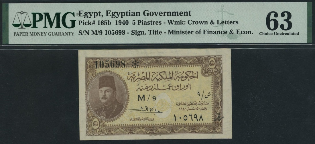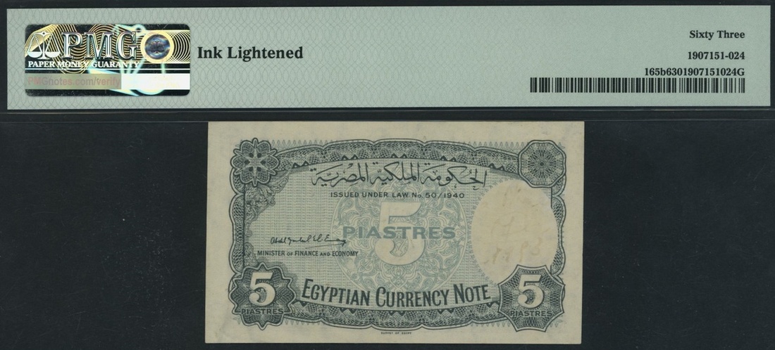 (x) Egyptian Government, 5 Piastres, 1940 (1945), serial number M/9 105698, (Pick 165b, BNB 212), in PMG holder 63 Choice Uncirculated, ink lightened