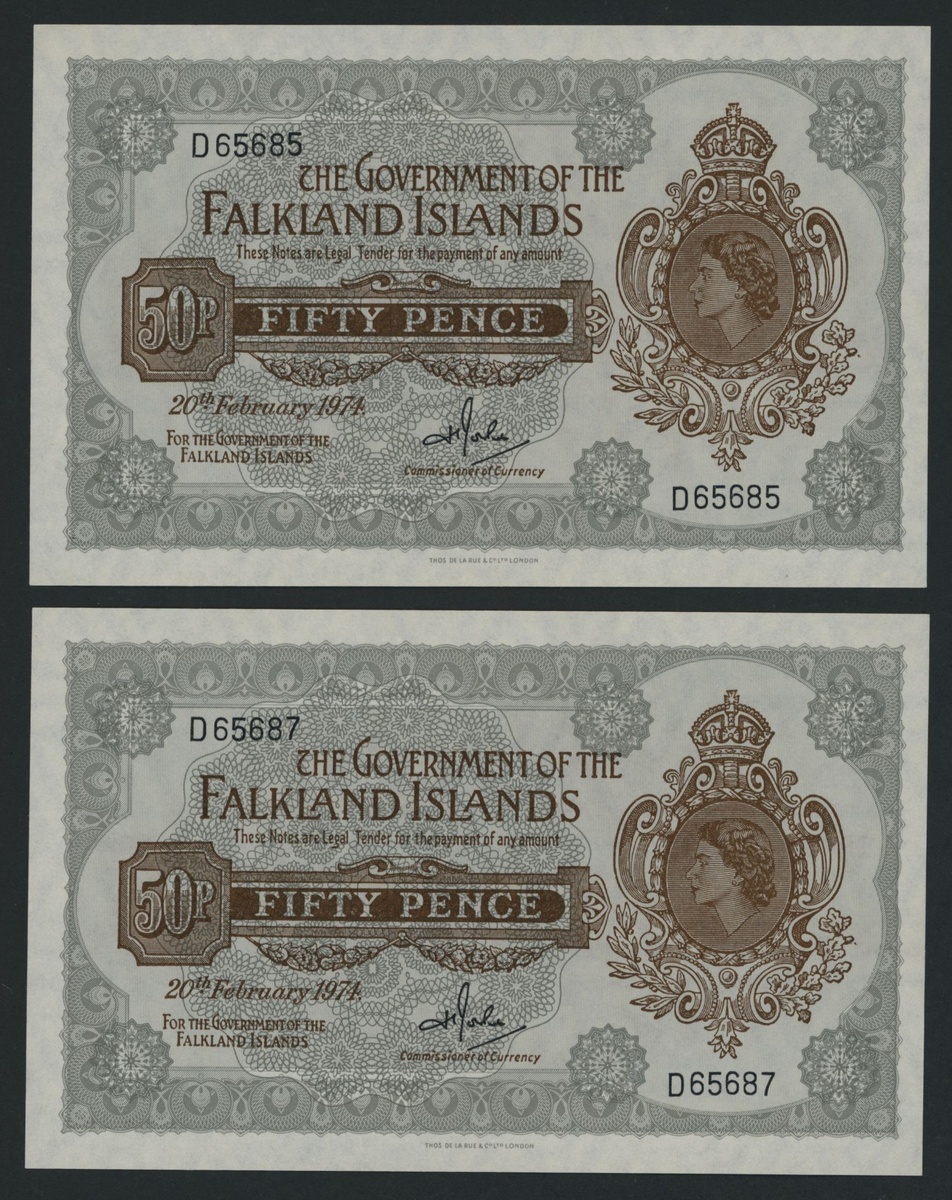 Government of the Falkland Islands, [2 notes] 50 Pence, 20th February 1974, serial numbers D65685 and D65687, (Pick 10b, BNB 215b), about uncirculated, evidence of handling on both (2 notes)
