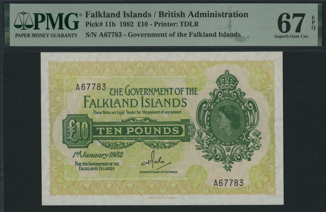 The Government of the Falkland Islands, *TOP POP* 10 Pounds, 1st January 1982, serial number A67783,