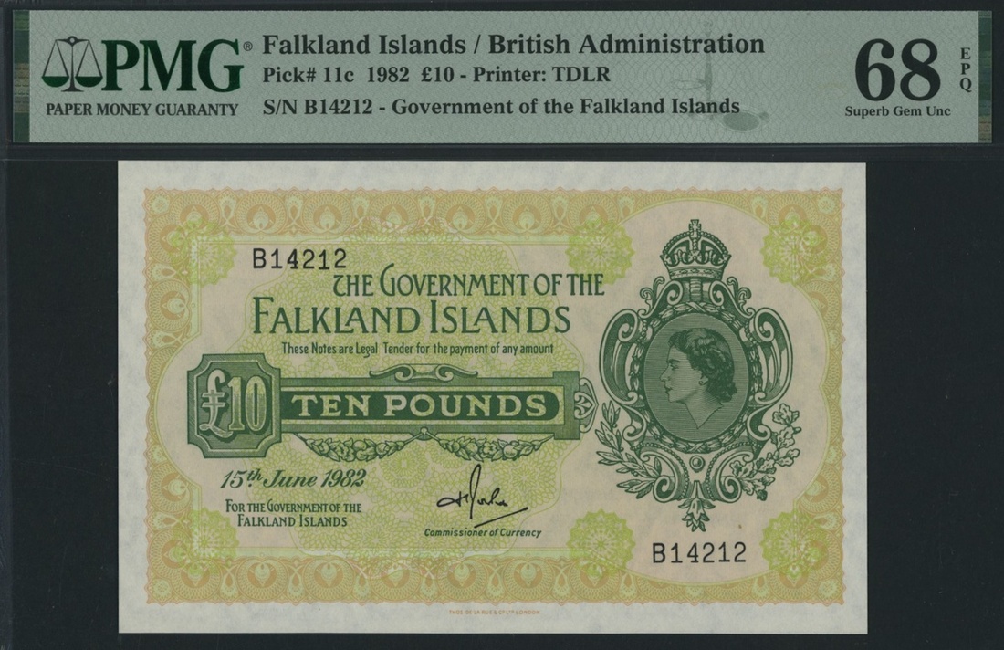 The Government of the Falkland Islands, *TOP POP* 10 Pounds, 15th June 1982, serial number B14212, (Pick 11c), in PMG holder 68 EPQ Superb Gem Uncirculated, the Single Finest graded on PMG census