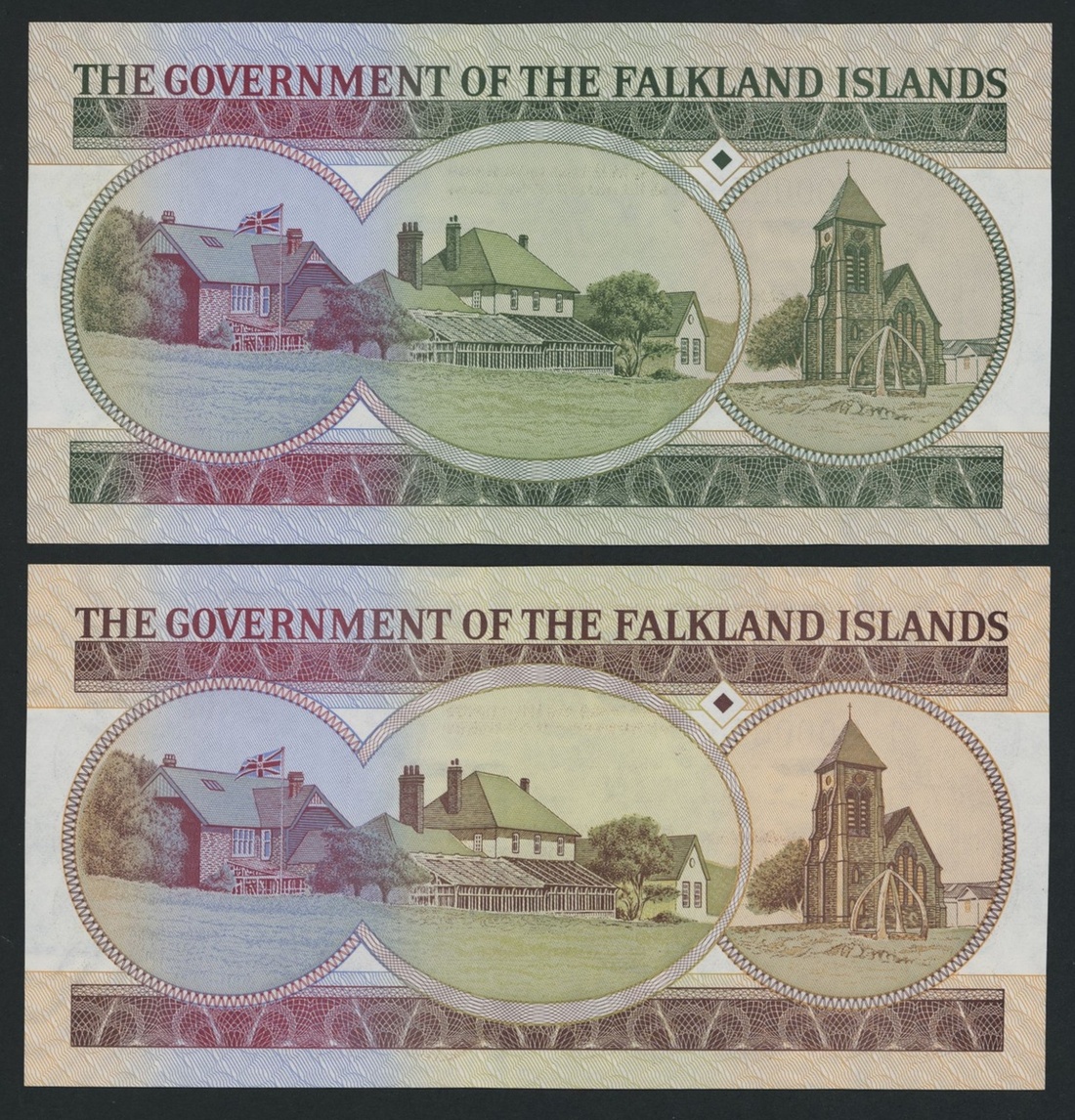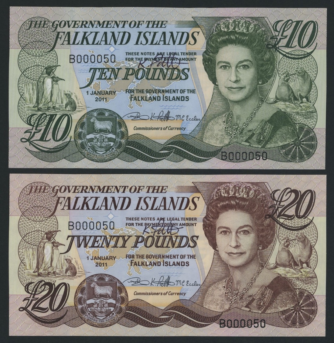 Government of the Falkland Islands, [2 notes] £10, £20, 1st January 2011, low serial number B000050,