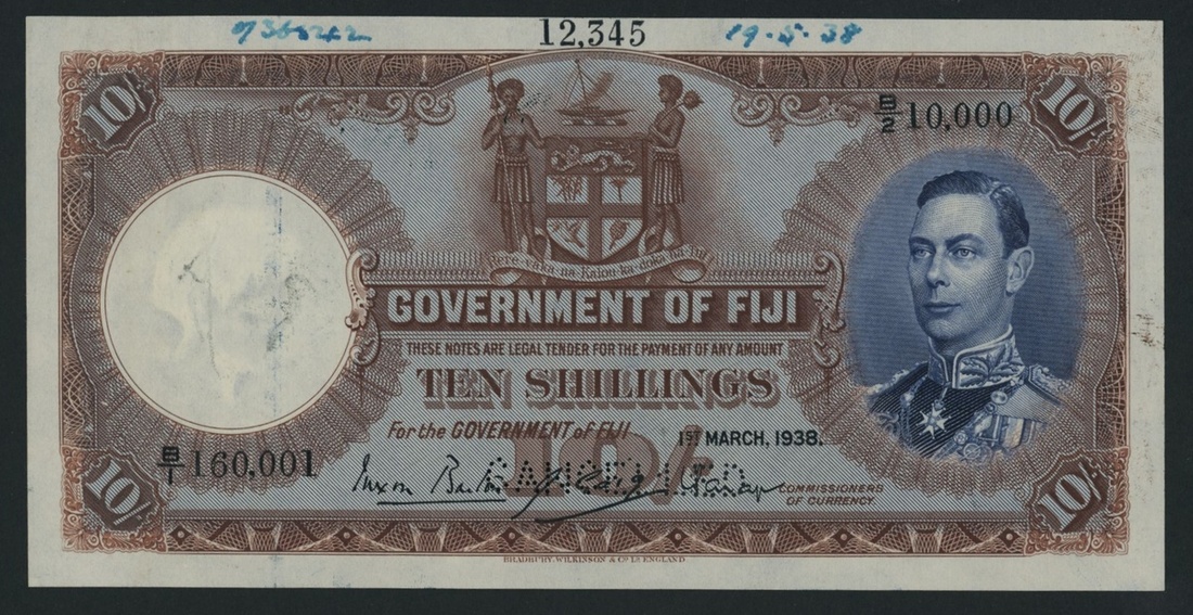 (x) Government of Fiji, specimen 10 Shillings, 1st March 1943, serial number B/1 160001 - B/2 10000, perforated CANCELLED