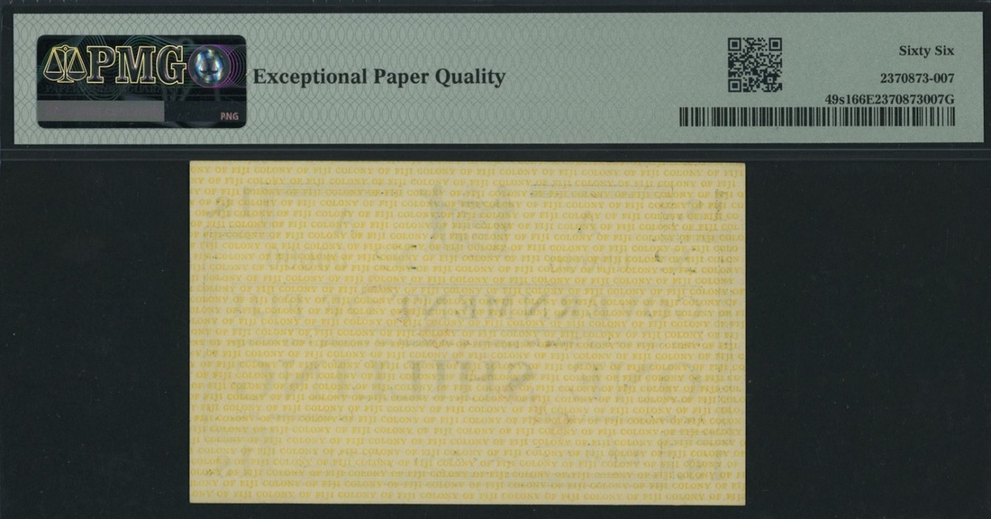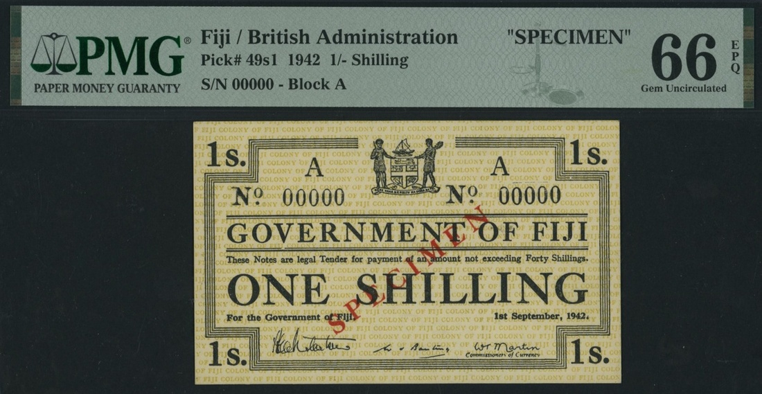 (x) Government of Fiji, *TOP POP* specimen, emergency issue 1 /-, 1942, serial number 000000 Block A, (Pick 49s1), in PMG holder 66 EPQ Gem Uncirculated, with only one note as specimen on PMG Census, incredible