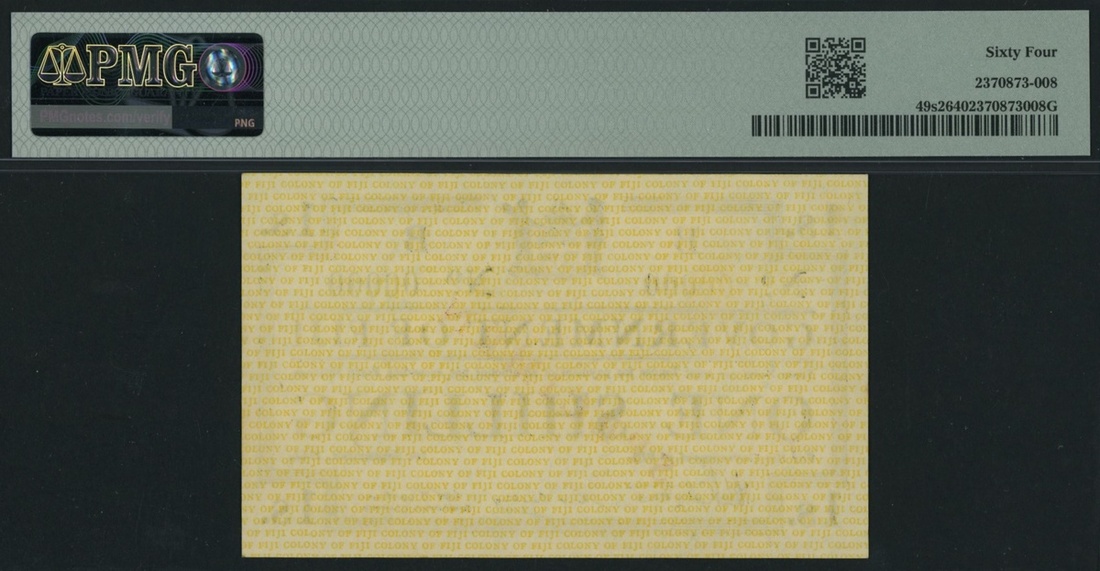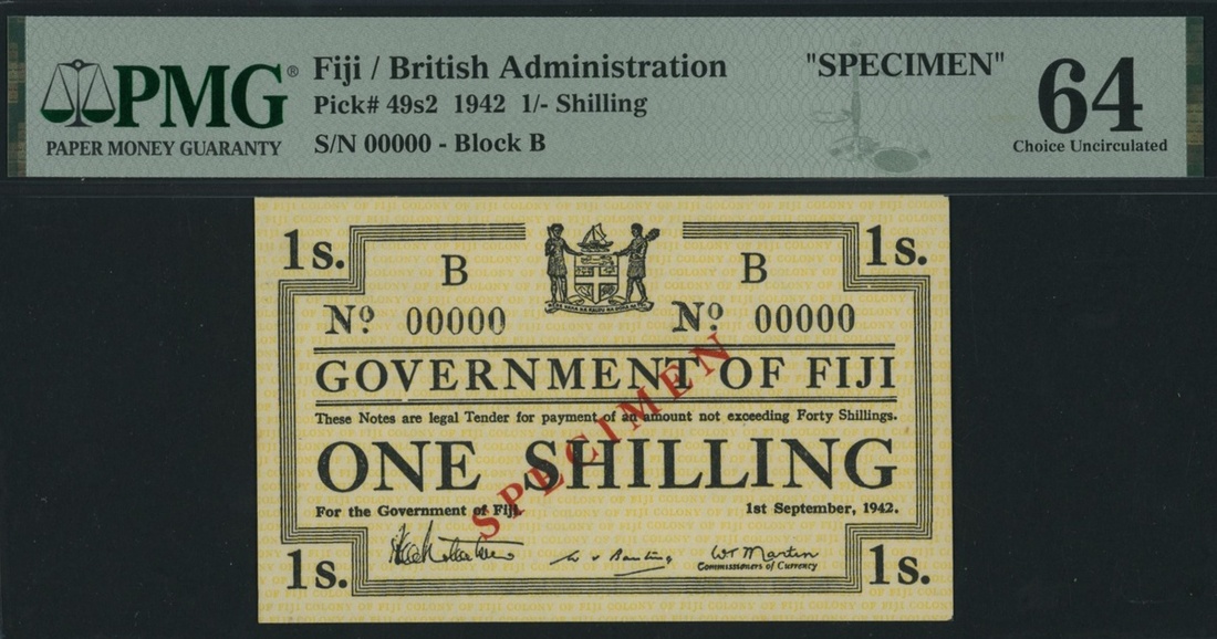 (x) Government of Fiji, specimen, emergency issue 1 /-, 1942, serial number 000000 Block A, (Pick 49s2), in PMG holder 64 Choice Uncirculated, with only one note as specimen on PMG Census, less than 10 notes on PMG Census