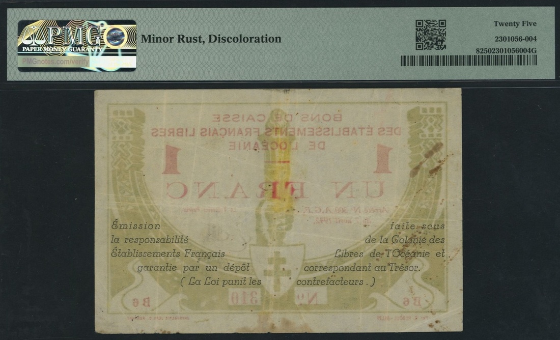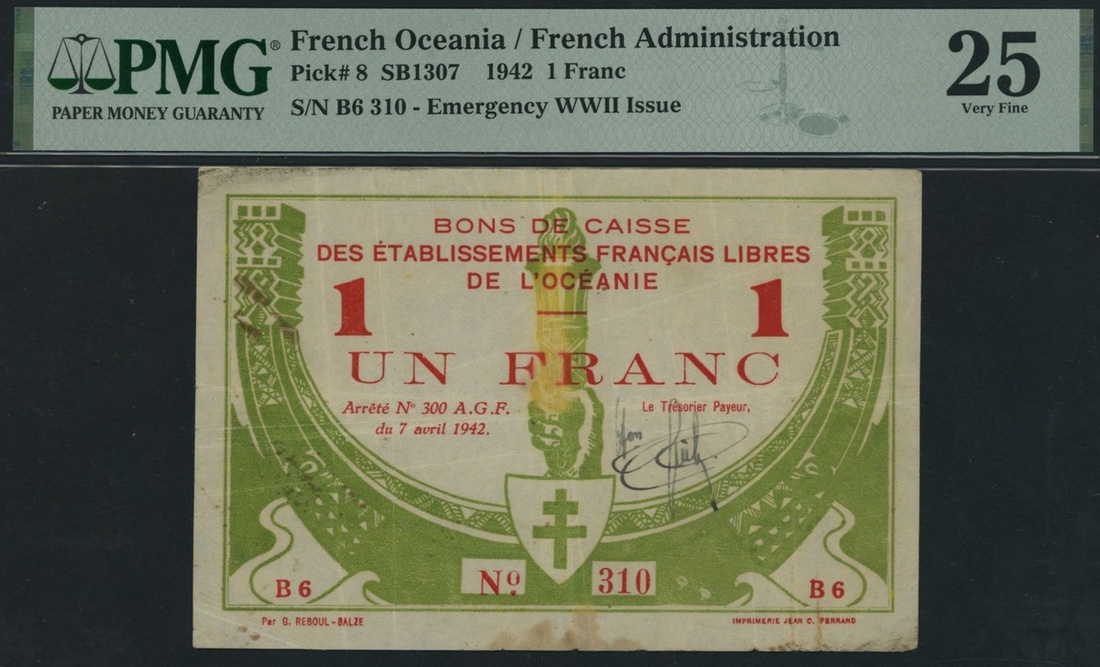 (x) French Oceania, 1 Franc, 7th April 1942, serial number B6 310, (Pick 8), in PMG holder 25 Very Fine, minor rust, discolouration