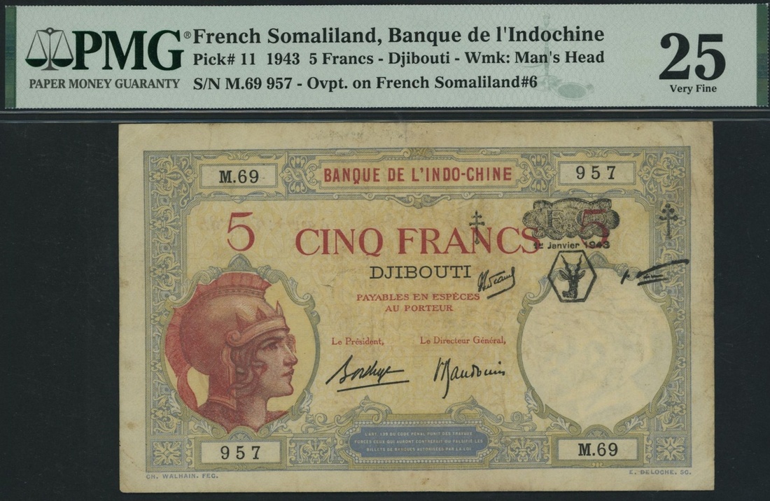 (x) Banque de l'Indochine, French Somaliland, 5 Francs, Djibouti, 1943, serial number M.69 957, (Pick 11, BNB 117), in PMG holder 25 Very Fine, only 6 notes in higher grade on PMG census