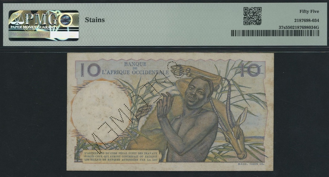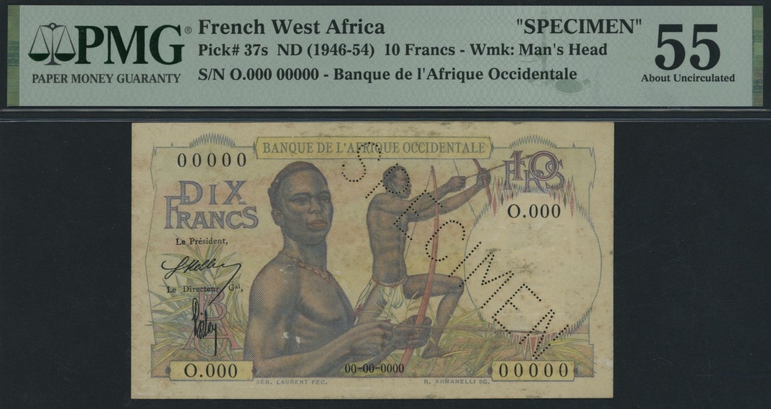 (x) Banque de l'Afrique Occidentale, French West Africa, specimen 10 Francs, ND (1946-54), serial number O.000 00000, (Pick 37s), in PMG holder 55 About Uncirculated, stains, only 3 notes in higher grade on PMG census