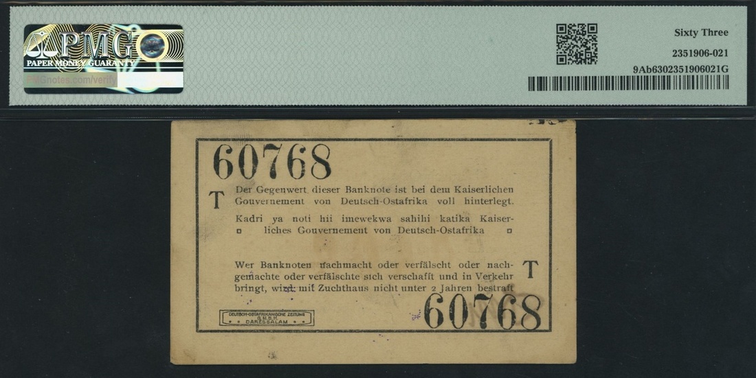 (x) German East Africa, 1 Rupie, 1st November 1915, serial number T60768, (Pick 9Ab), in PMG holder 63 Choice Uncirculated, only 10 notes in a higher grade on PMG Census
