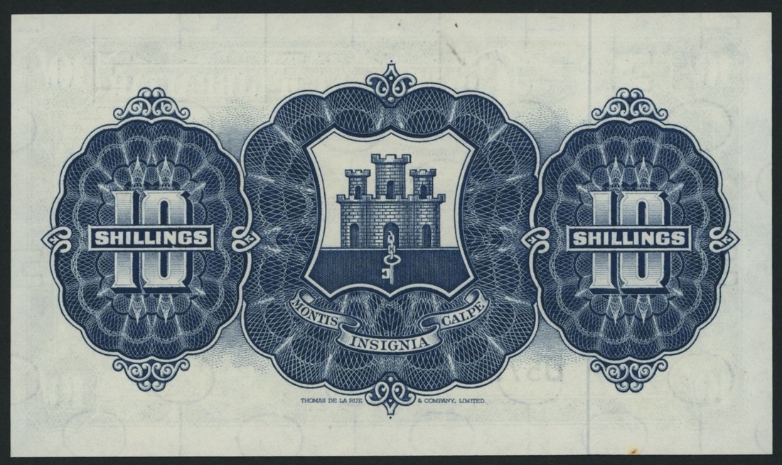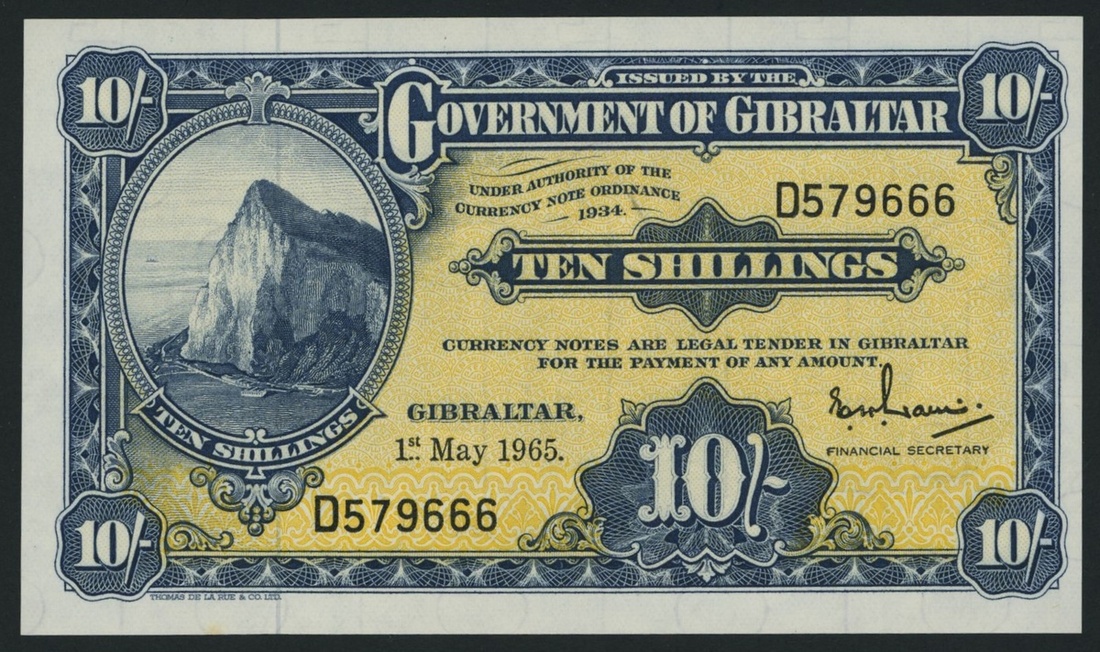 Government of Gibraltar, 10 Shillings, 1st May 1965, serial number D579666, (Pick 17, BNB 115) minor stains to reverse of note, otherwise uncirculated