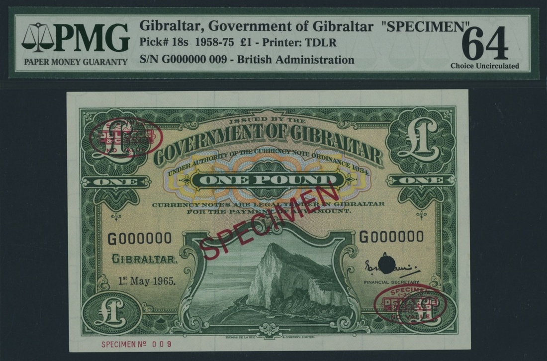 Government of Gibraltar, specimen 1 Pound, 1st May 1965, serial number G000000 009 (Pick 18s), in PMG holder 64 Choice Uncirculated