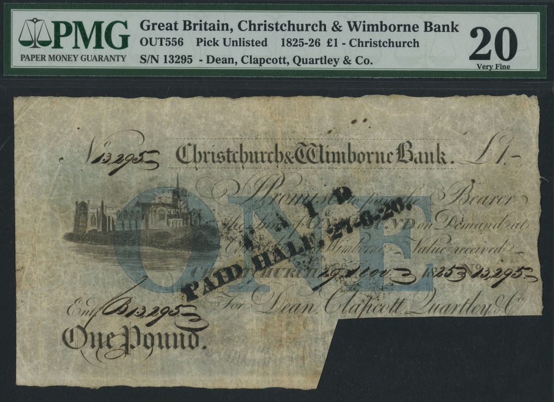 (x) Christchurch & Wimborne Bank, Great Britain, £1, Christchurch, 1825-26, serial number 13295, for Dean, Clapcott, Quartley & Co.,