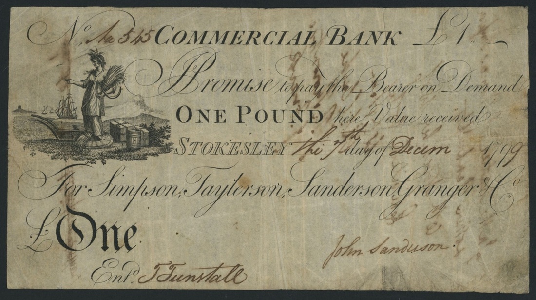 (x) Commercial Bank, Stokesley, £1, 7th December 1799, serial number 545, for Simpson, Taylerson, Sanderson, Granger & Co., handsigned John Sanderson, J. Turnstall,