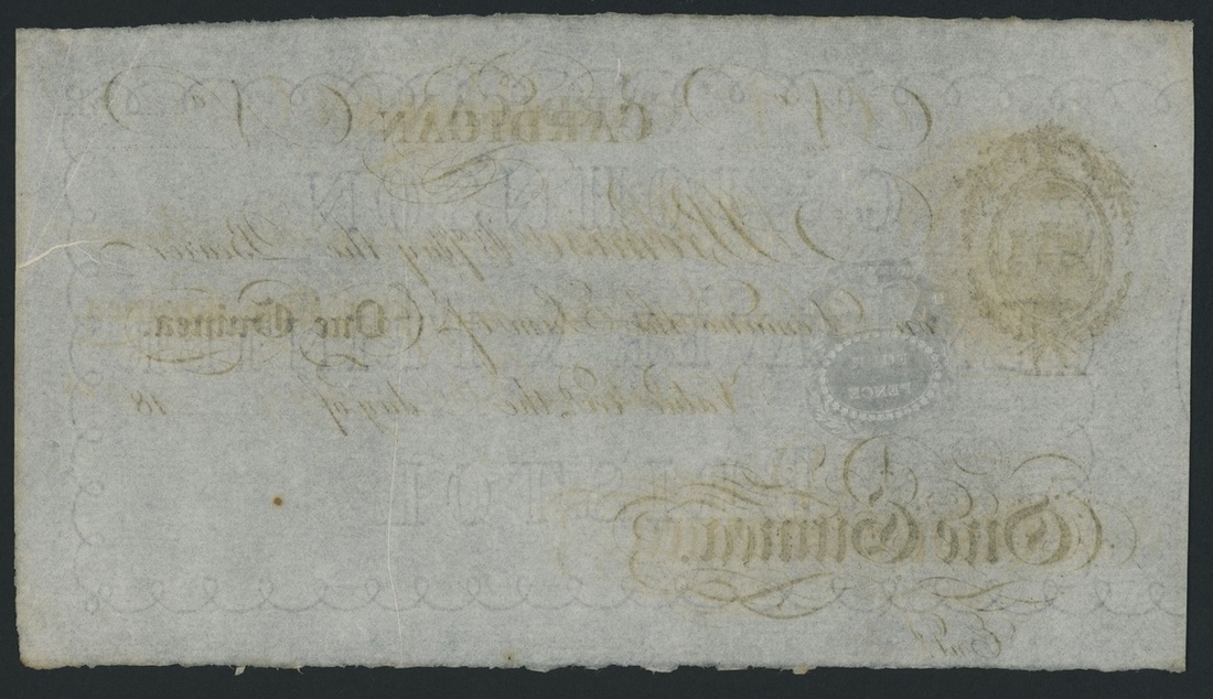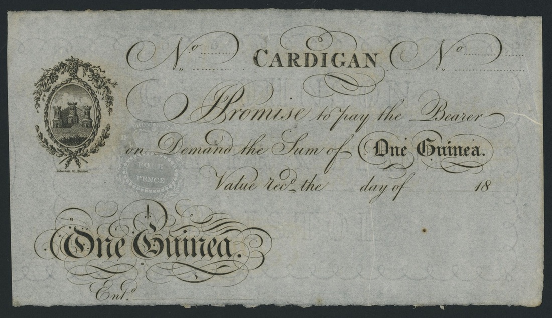 (x) Cardigan, 1 guinea, unissued, 18-, no serial number, black and white on watermarked paper, value at lower left and right, vignette of castle at top left, impressed duty stamp at left