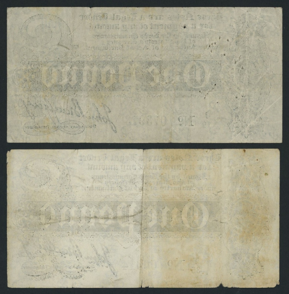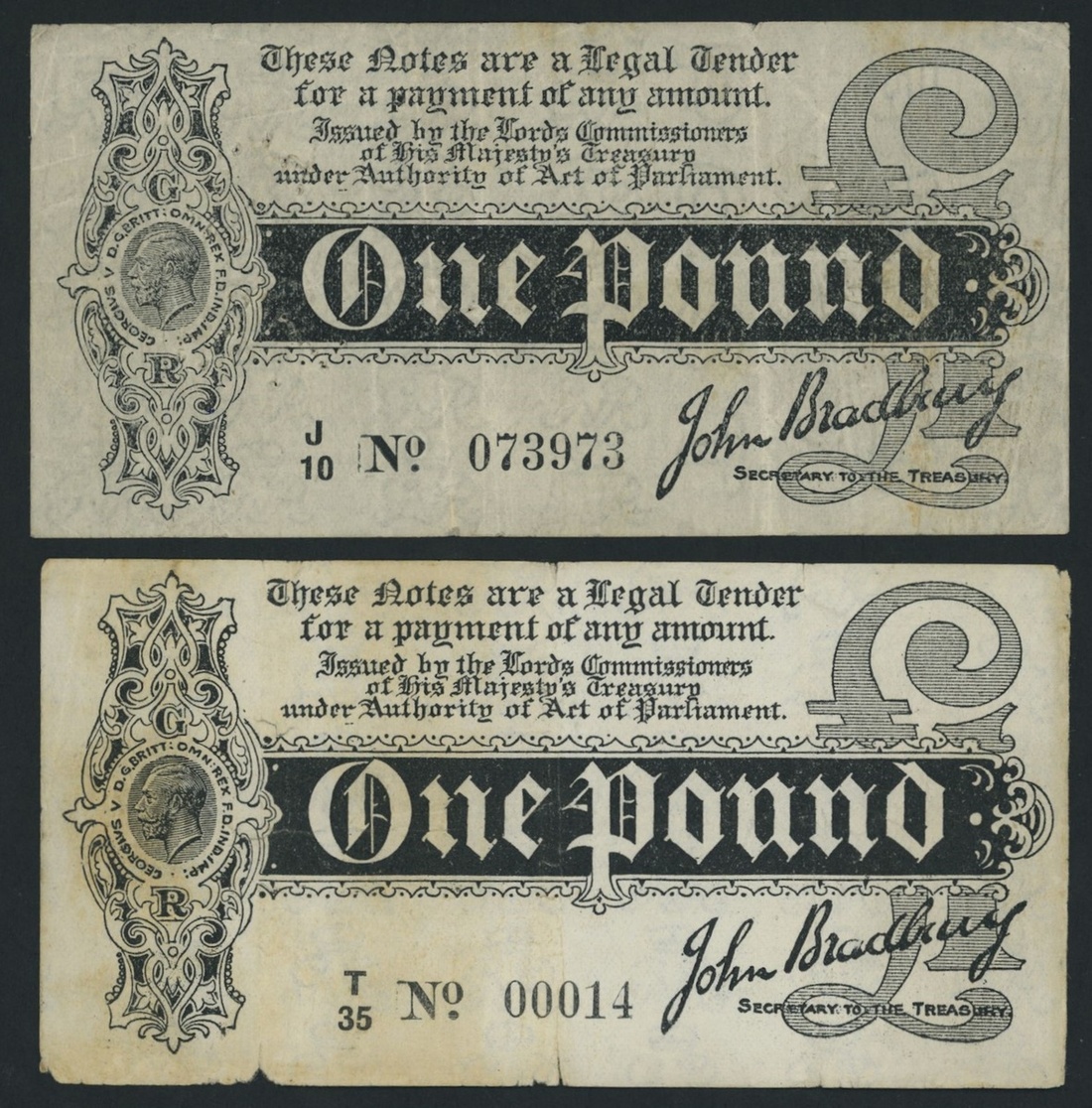 Treasury Series, John Bradbury, [2 notes] £1, ND (1914), serial numbers J/10 073973 and T/35 00014, (EPM T3 type 2, T3 type 3), very good to fine (2 notes)