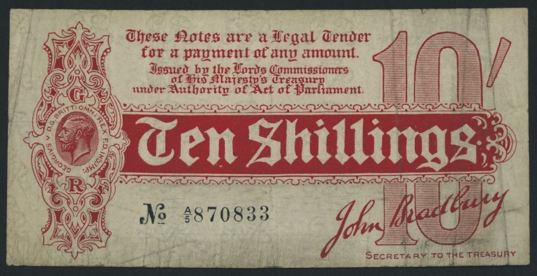 Treasury Series, John Bradbury, 10 Shillings, ND (1914), serial number A/5 870833,
