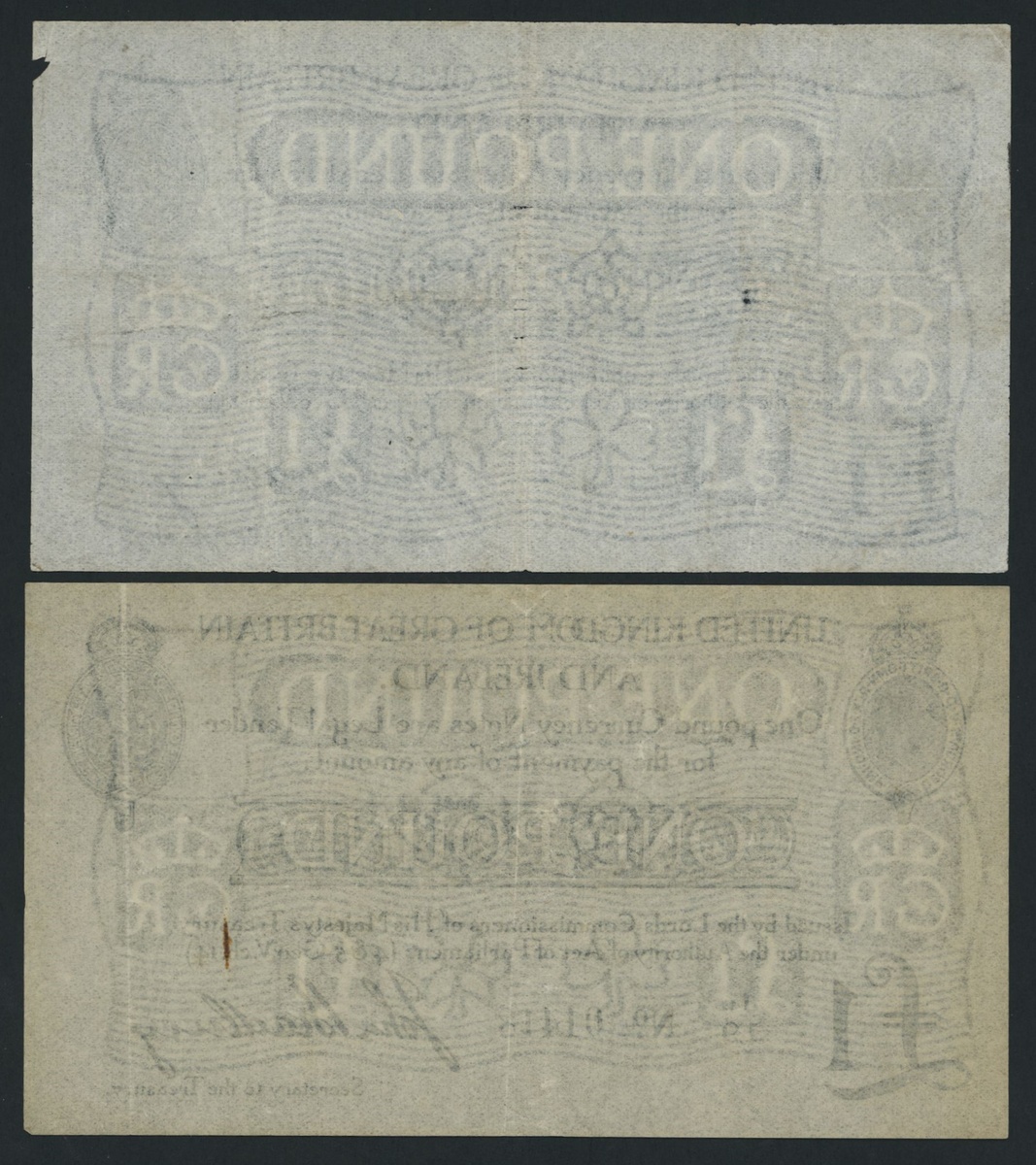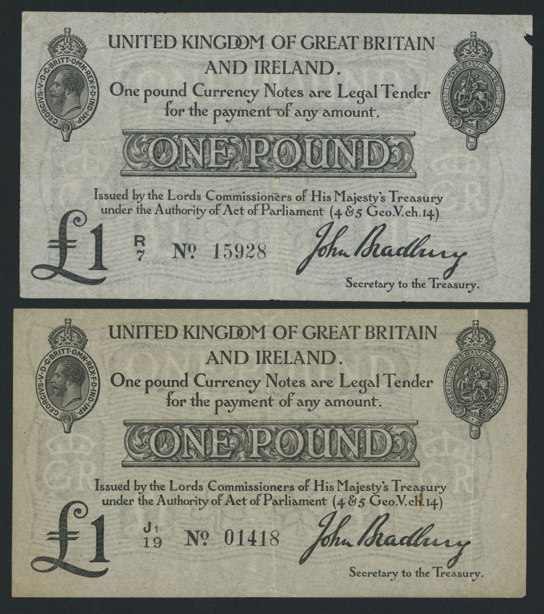Treasury Series, John Bradbury, [2 notes] £1, ND (1914), serial numbers R/7 15928 and J1/19 01418,