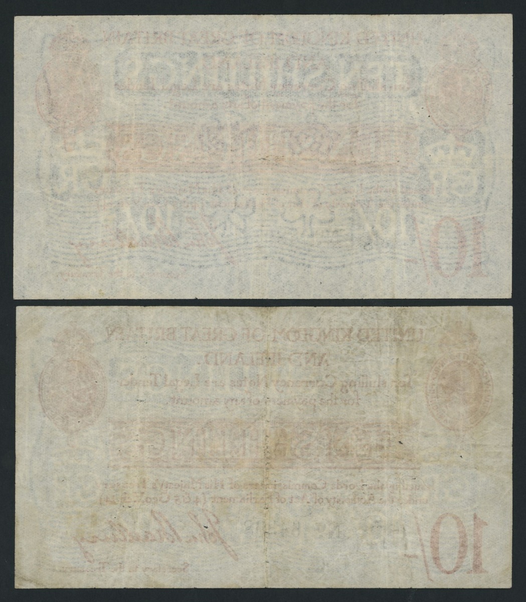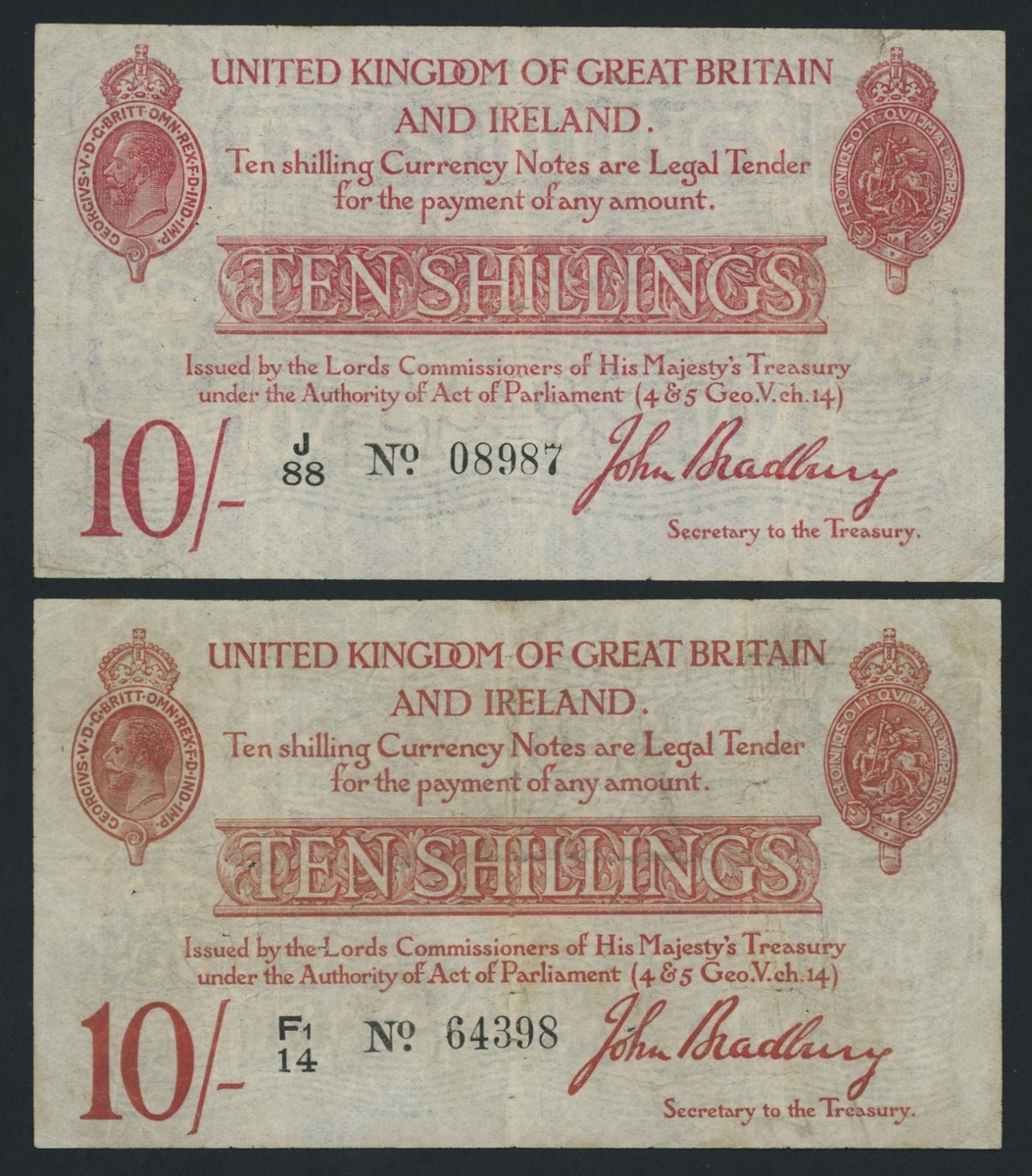 Treasury Series, John Bradbury, [2 notes] 10 Shillings, ND (1914), serial numbers J/88 08987 and F1/14 64398,