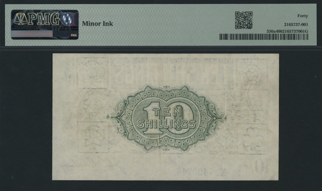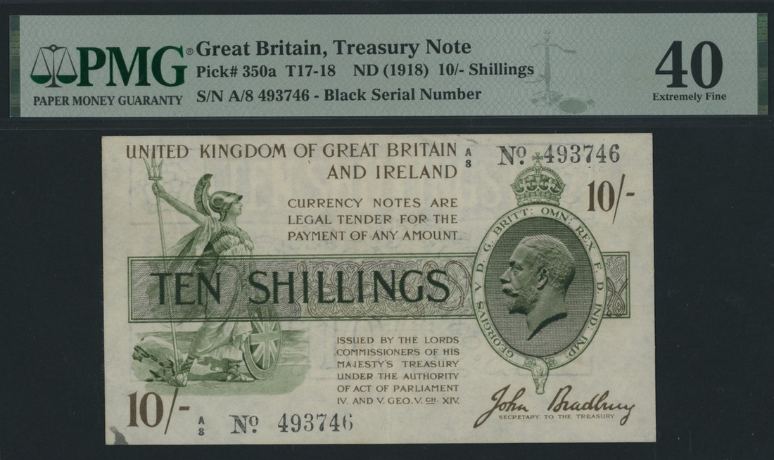 Treasury Series, Bradbury, 10 Shillings, ND (1918), serial number A/8 493746, prefix with black dot