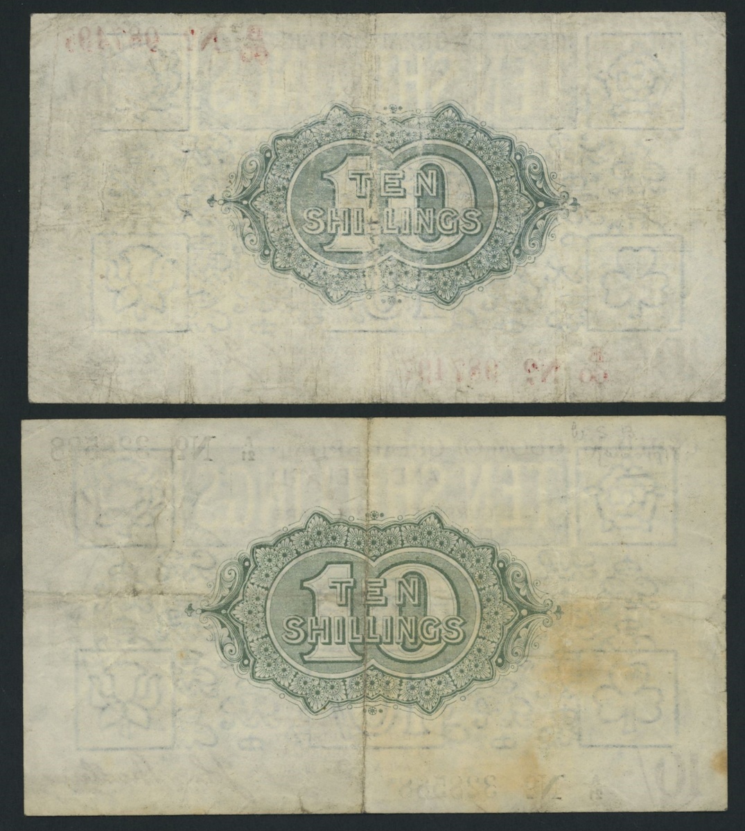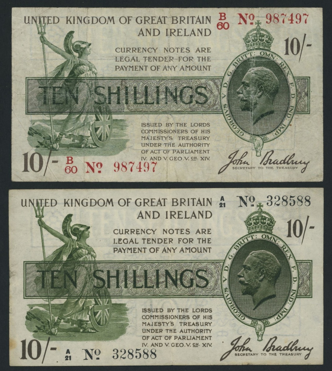 Treasury Series, John Bradbury, [2 notes] 10 Shillings, ND (1918), serial numbers A/21 328588 and B/60 987497,