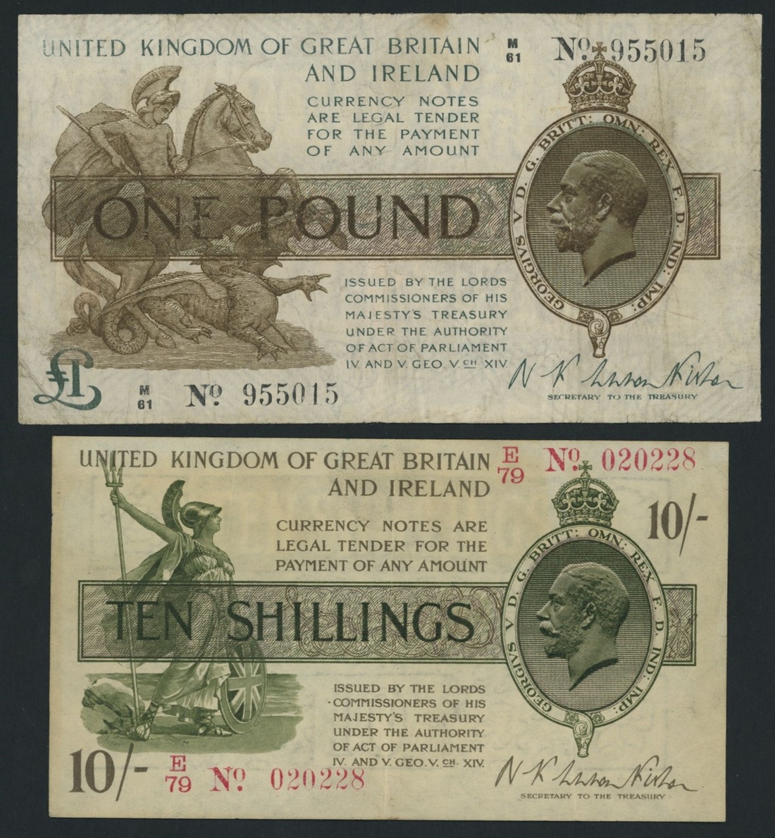 Treasury Series, N. F. W. Fisher, [2 notes] 10 Shillings, £1, ND (1919),