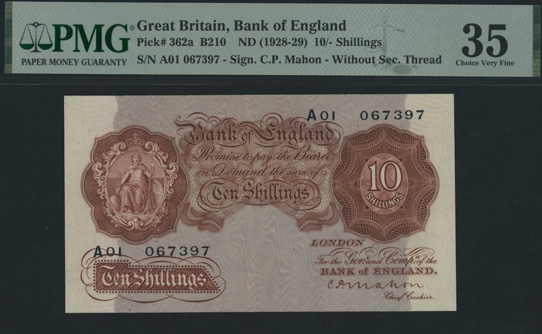 Bank of England, Mahon, 10 Shillings, ND (1928), serial number A01 067397, inaugural run prefix,