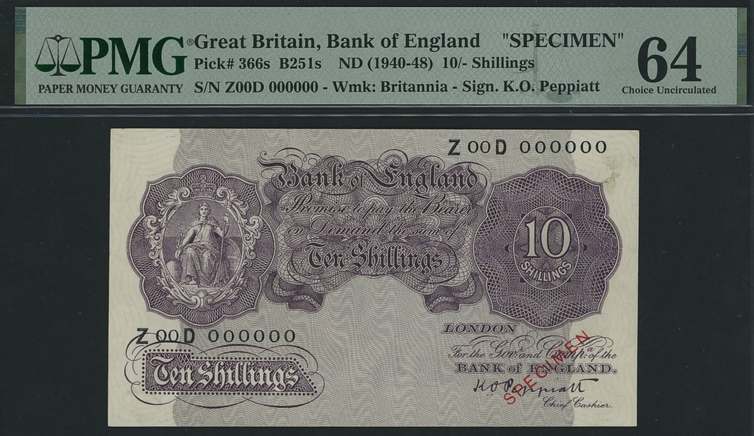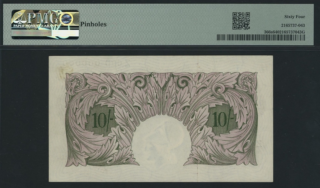 (x) Bank of England, K. O. Peppiatt, *TOP POP* specimen 10 Shillings, ND (1940), serial number Z00D 000000, (EPM B251s), in PMG holder 64 Choice Uncirculated, pinholes, finest graded note on PMG Census