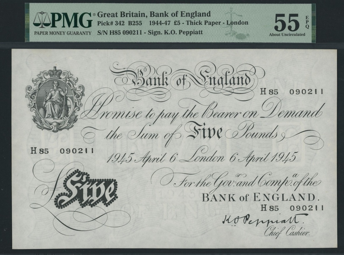 Bank of England, K. O. Peppiatt, £5, London, 6th April 1945, serial number H85 090211, (Pick 342, EPM B255), in PMG holder 55 EPQ About Uncirculated