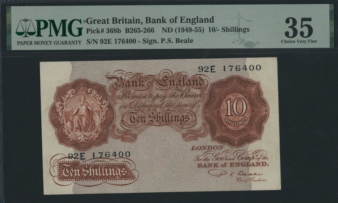 Bank of England, P. S. Beale, 10 Shillings, ND (1950), first run serial number 92E 176400, (Pick 368b, EPM B265), in PMG holder 35 Choice Very Fine