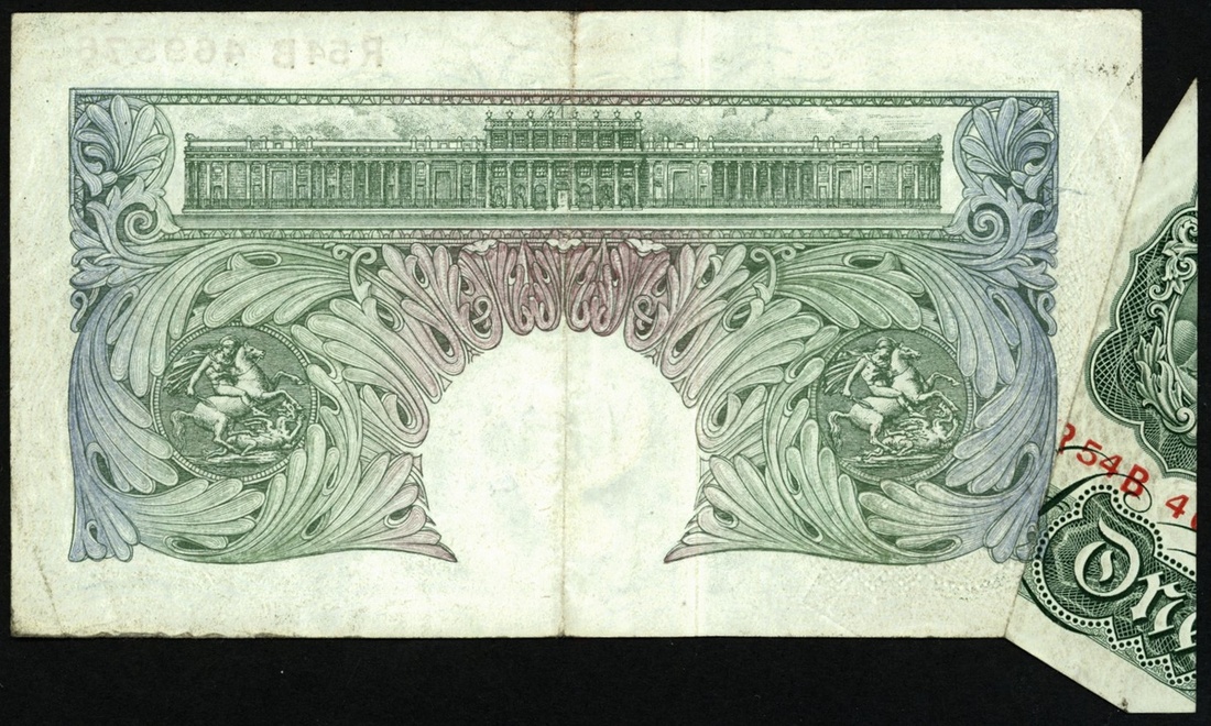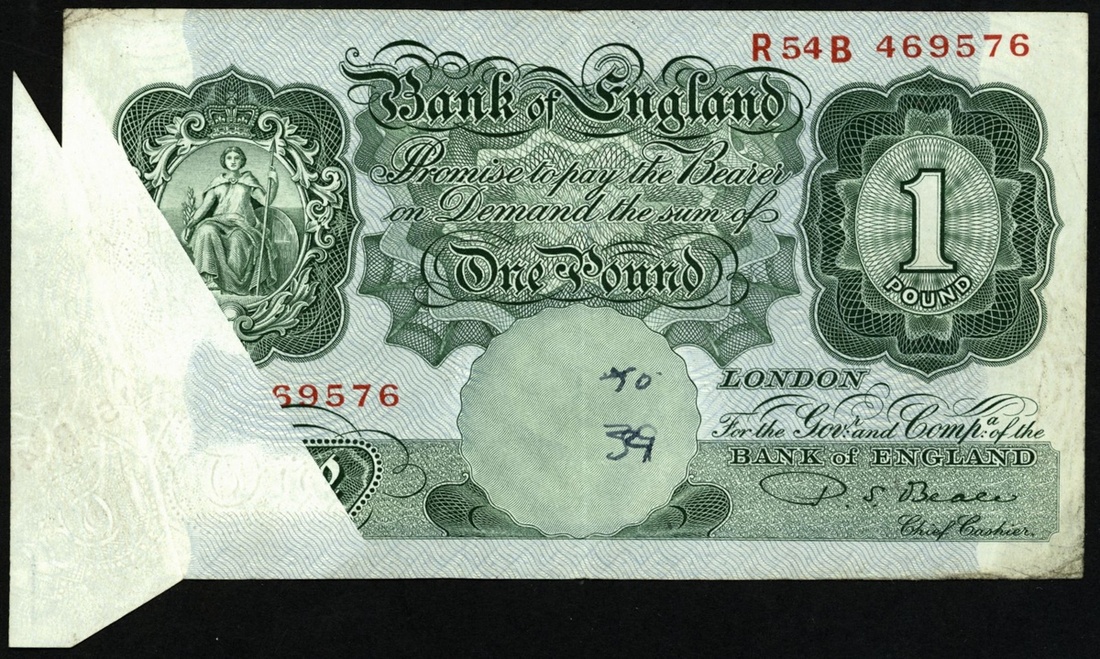 (x) Bank of England, P.S. Beale, ERROR £1, ND (1950), serial number R54B 469576, green with Britannia at upper left and value opposite upper right.