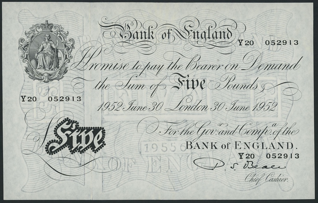 Bank of England, £5, P. S. Beale, 30th June 1952, serial number Y20 052913, last series
