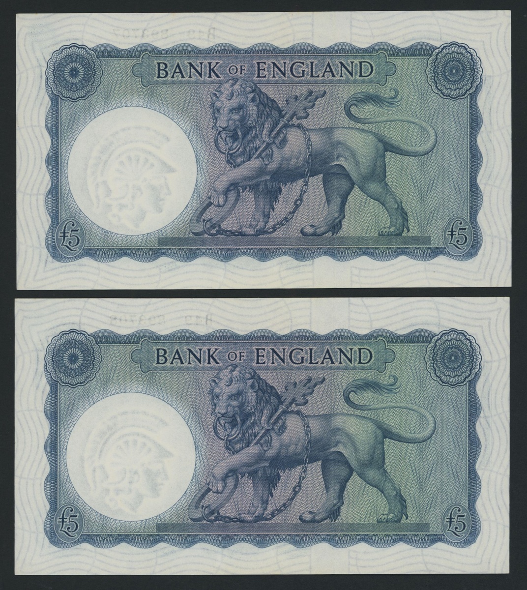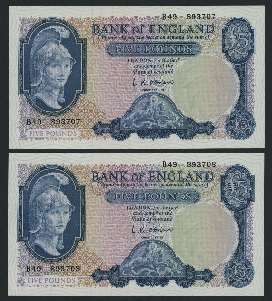Bank of England, [2 notes] L. K. O'Brien, £5, 1957, consecutive serial numbers B49 893707-08, (EPM B277), about uncirculated, scarce in a consecutive pair