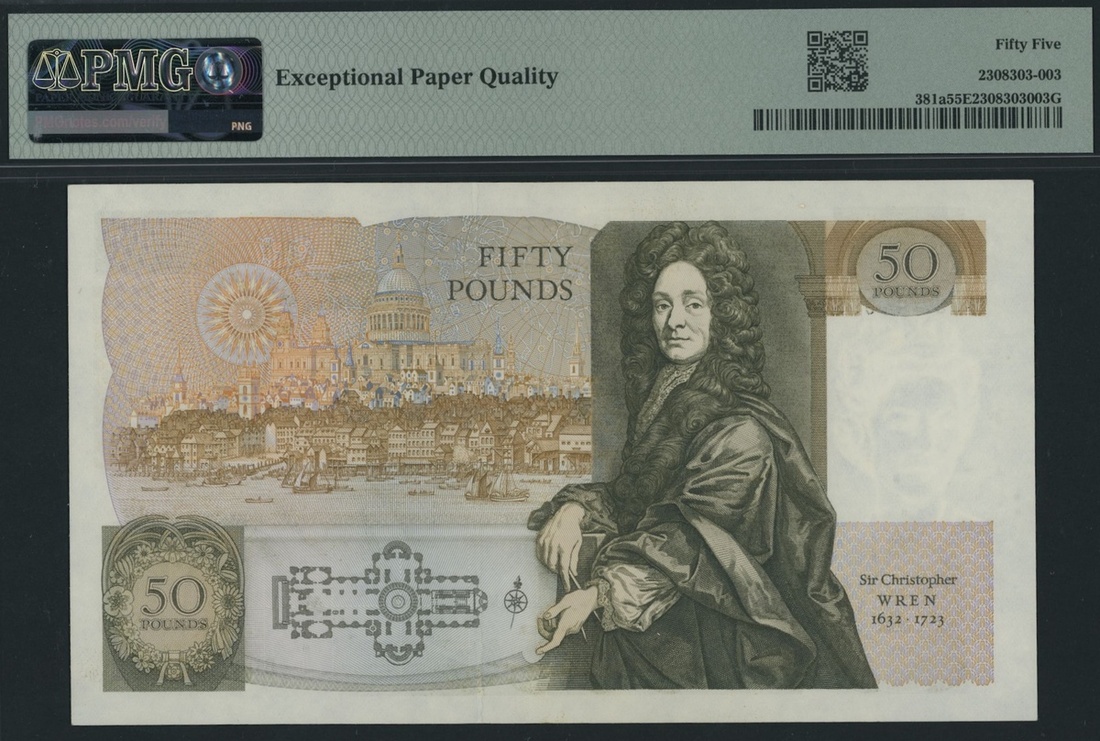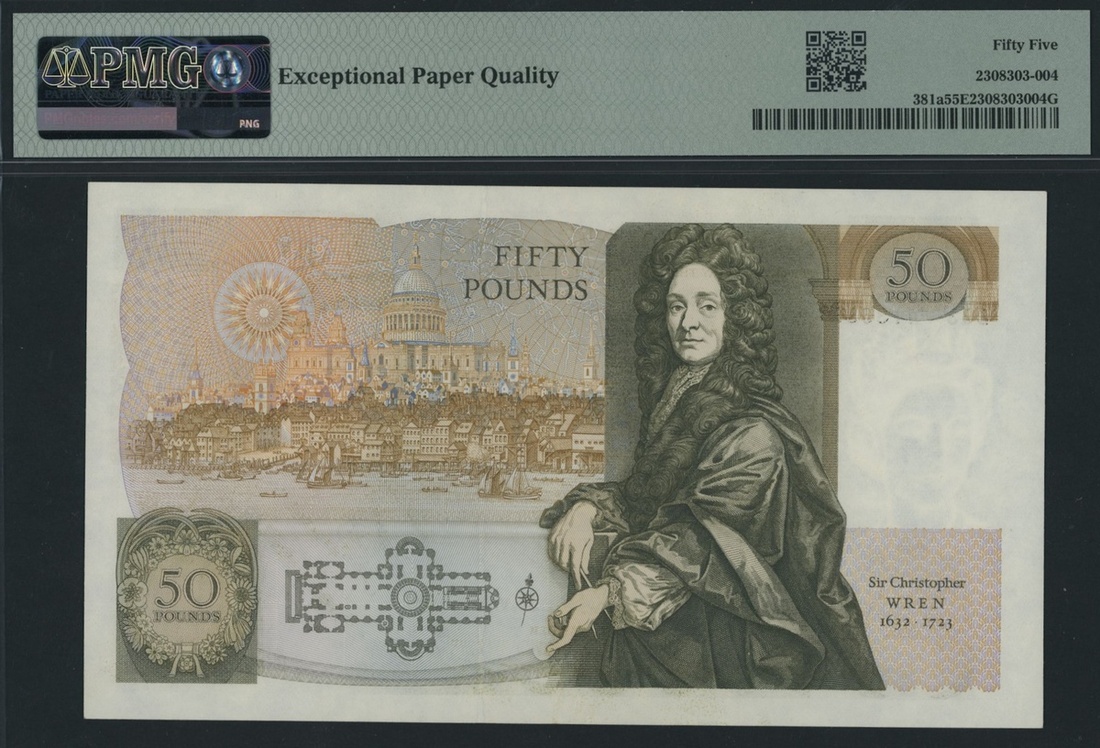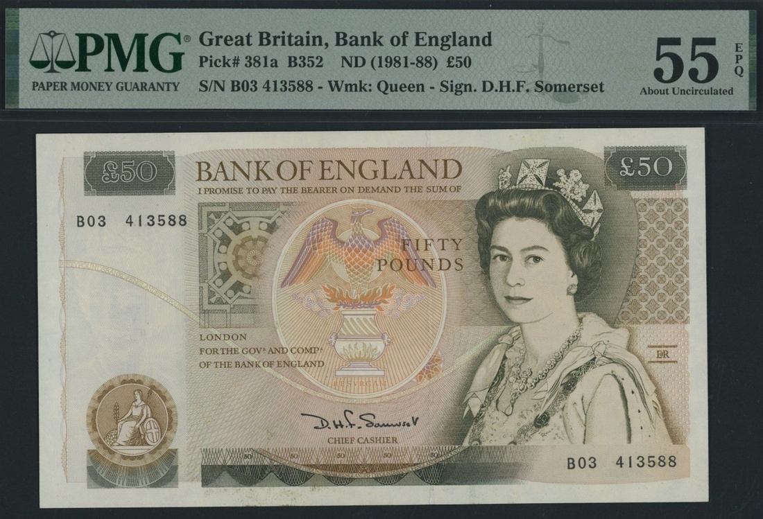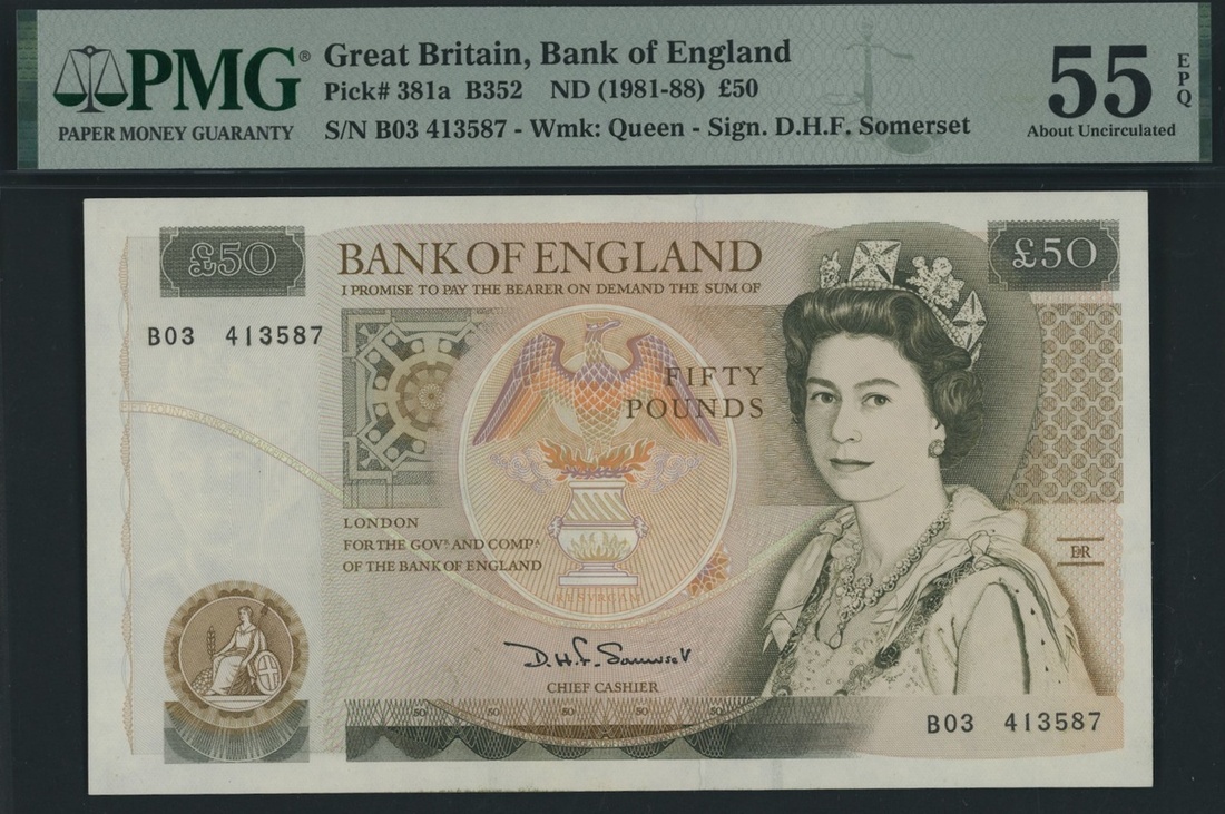 (x) Bank of England, D. H. F. Somerset, [2 notes] £50, ND (1981), consecutive serial numbers B03 413587-8, (Pick 381a, EPM B352), both in PMG holder 55 About Uncirculated (2 notes)