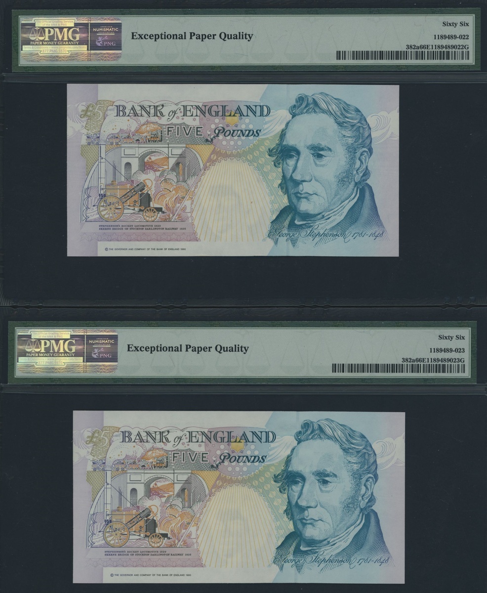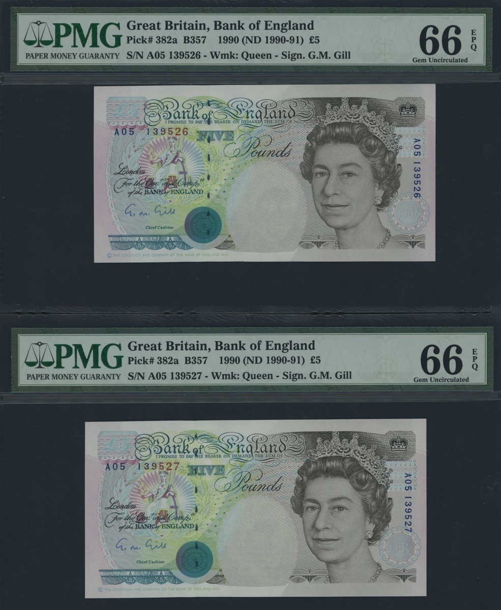 Bank of England, [2 notes] G. M. Gill, £5, 1990, consecutive serial numbers A05 139526-27, (EPM B357), in PMG holders 66 EPQ Gem Uncirculated [2 notes]