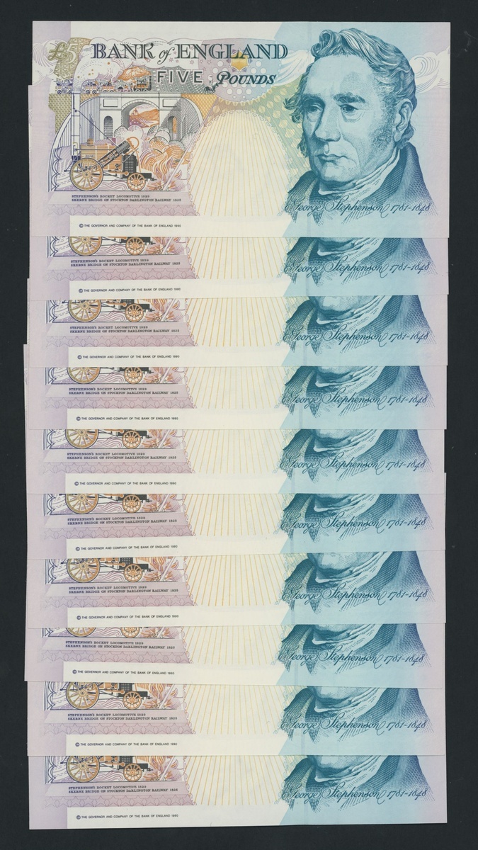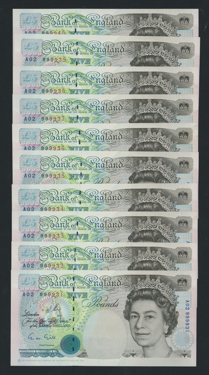 Bank of England, [10 notes] £5, G. M. Gill, 1990, consecutive serial numbers A02 999931-940, includes the same serial number 999936 shown in three other lots containing 5 Debden Security Printing sets,