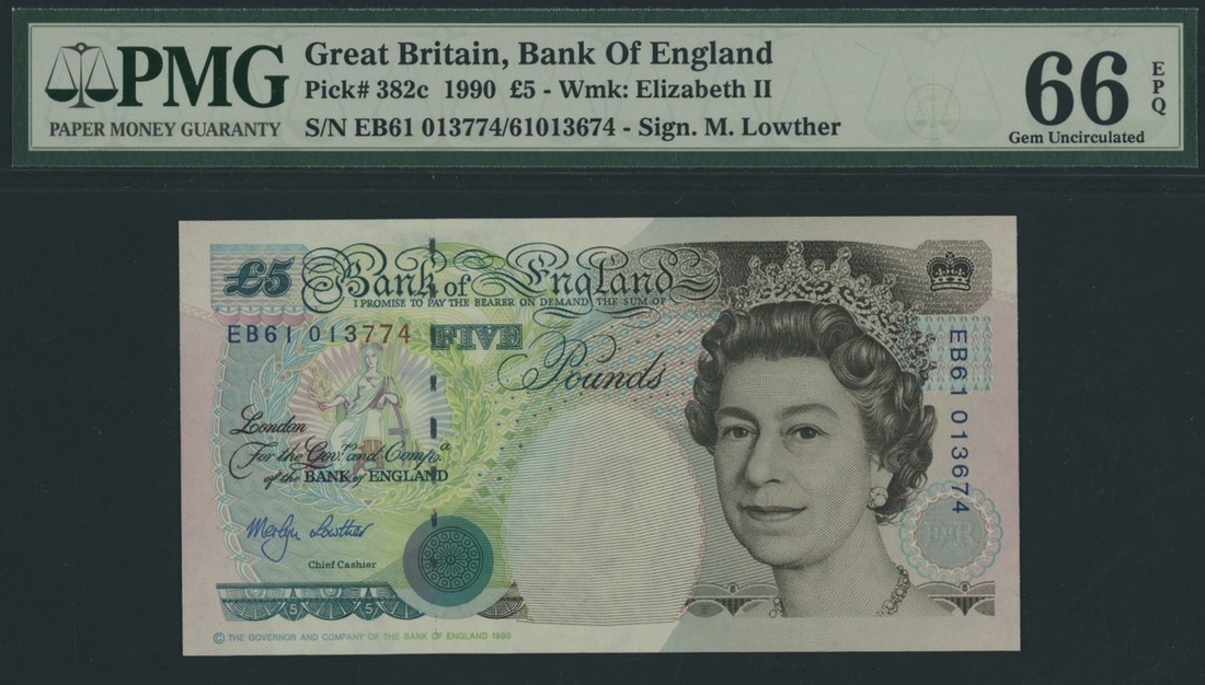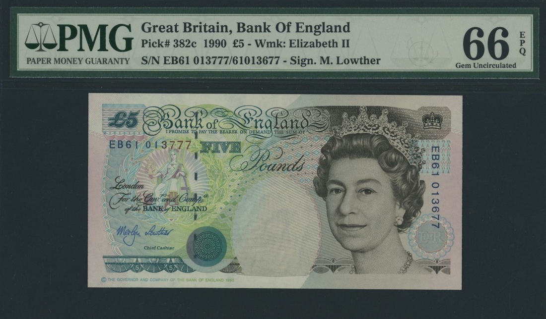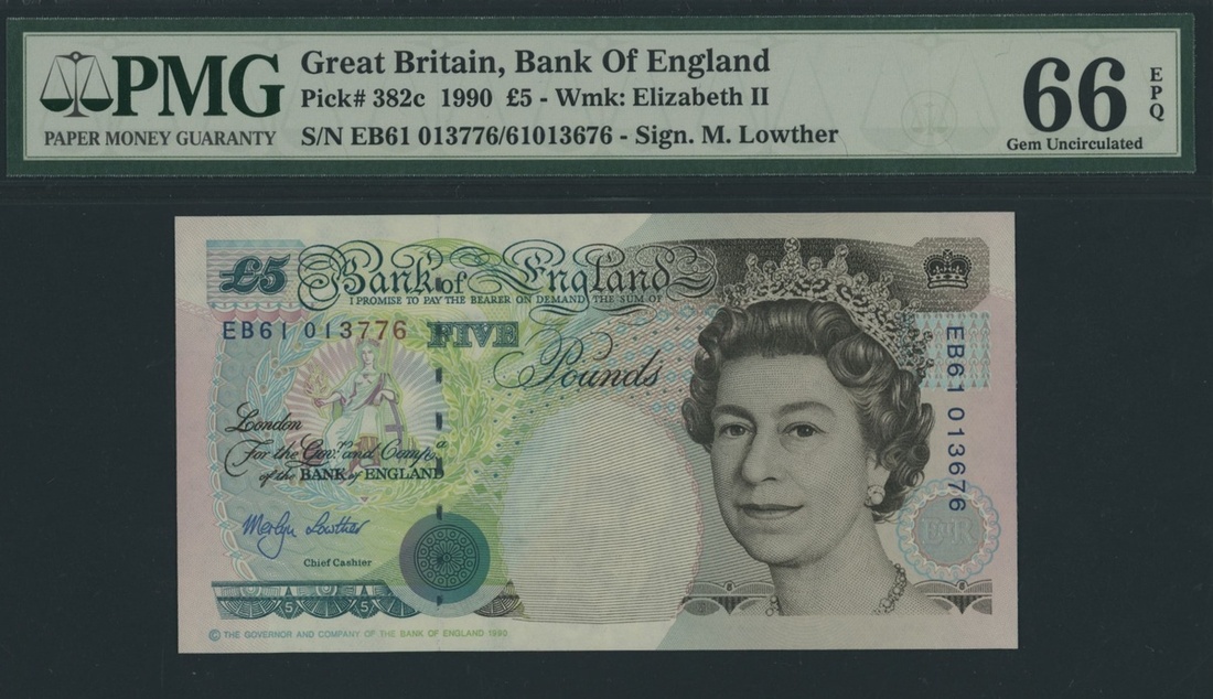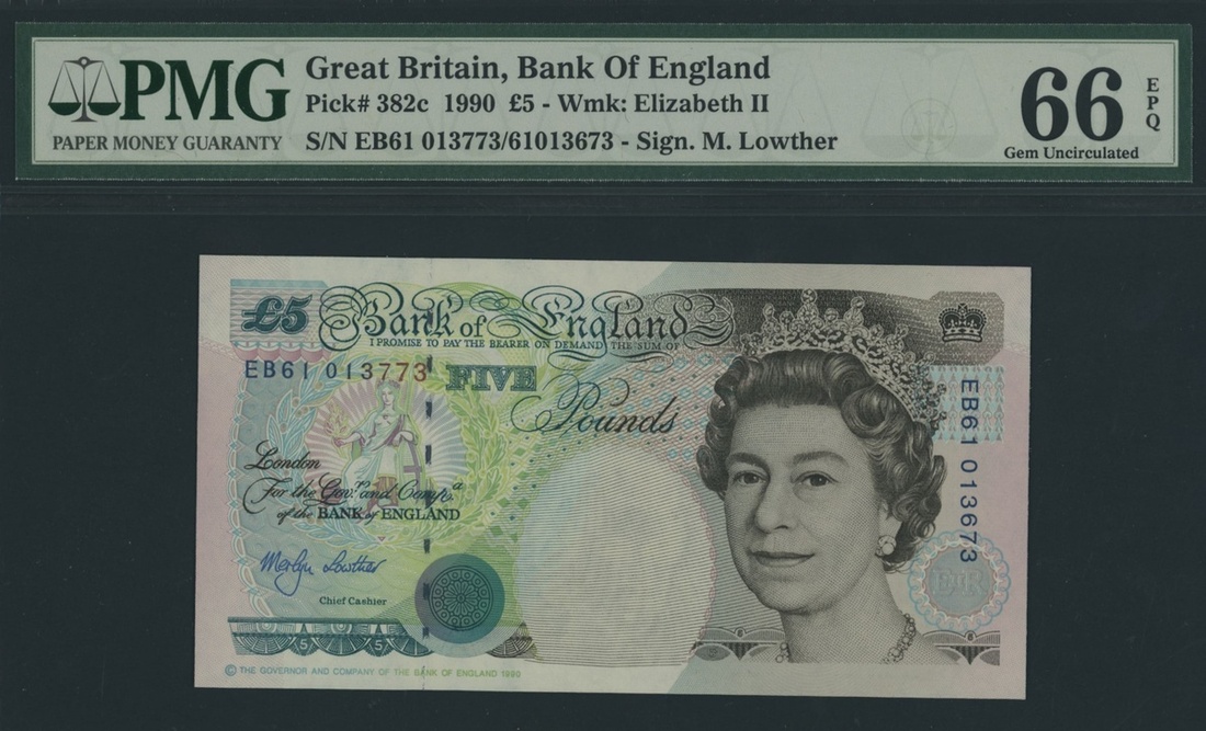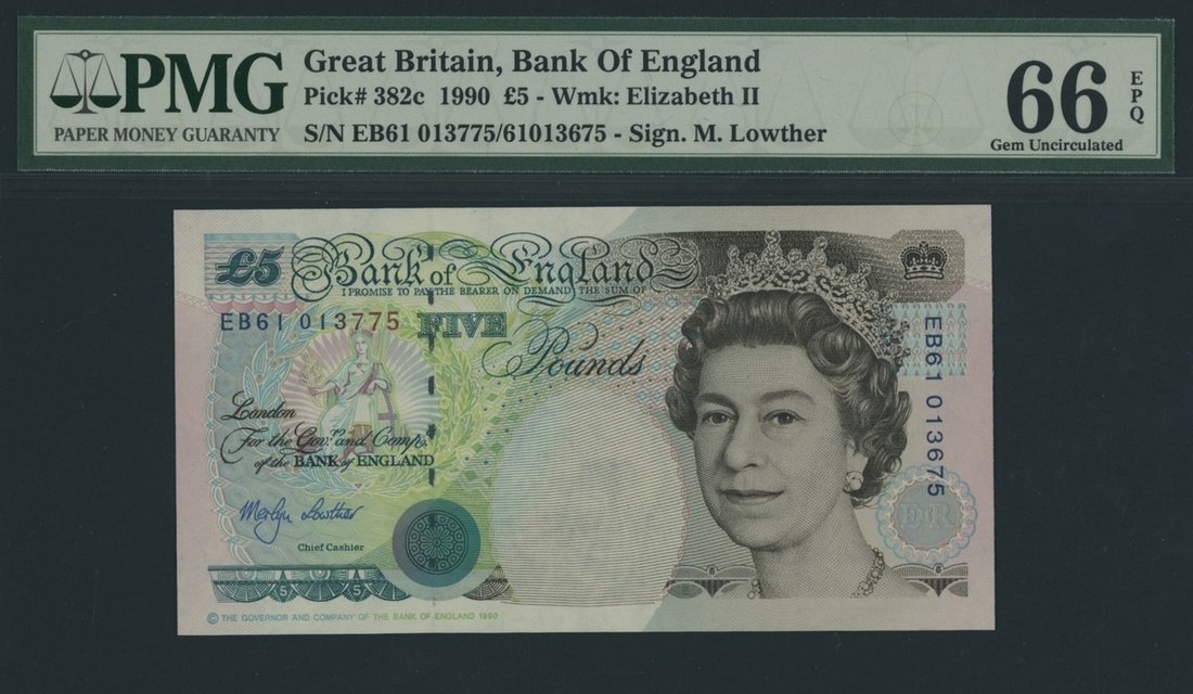 (x) Bank of England, [5 notes] error £5, M. V. Lowther, 1990, consecutive mismatched serial numbers EB61 013773-777/013673-677, (EPM B380), in PMG holders 66 EPQ Gem Uncirculated (5 notes)