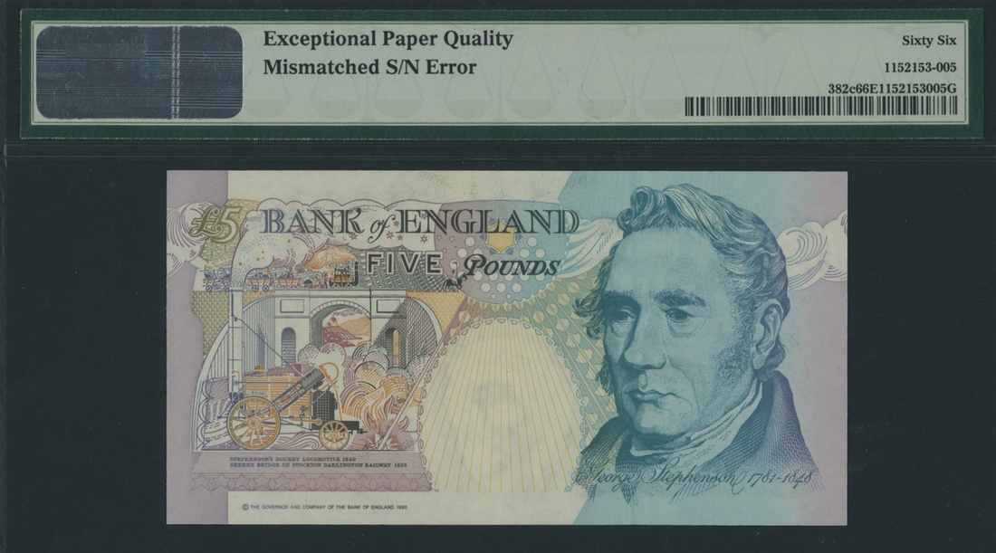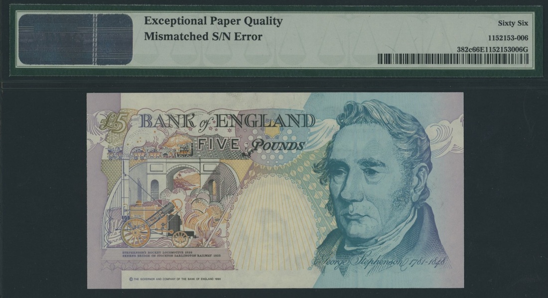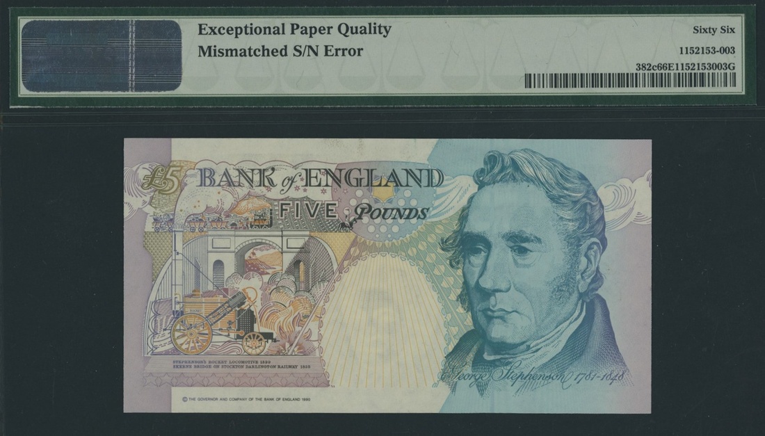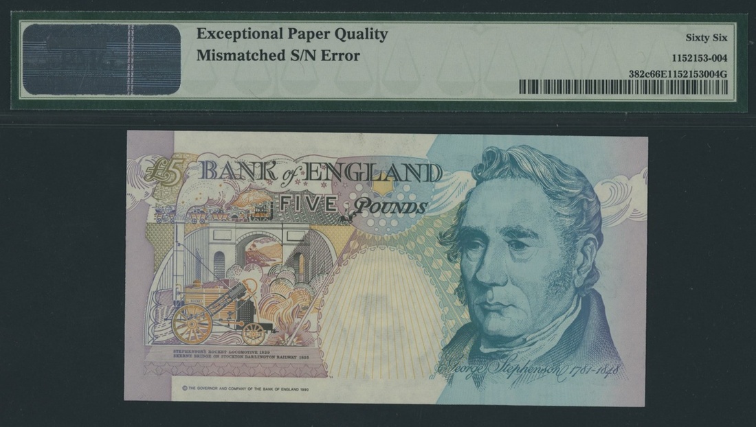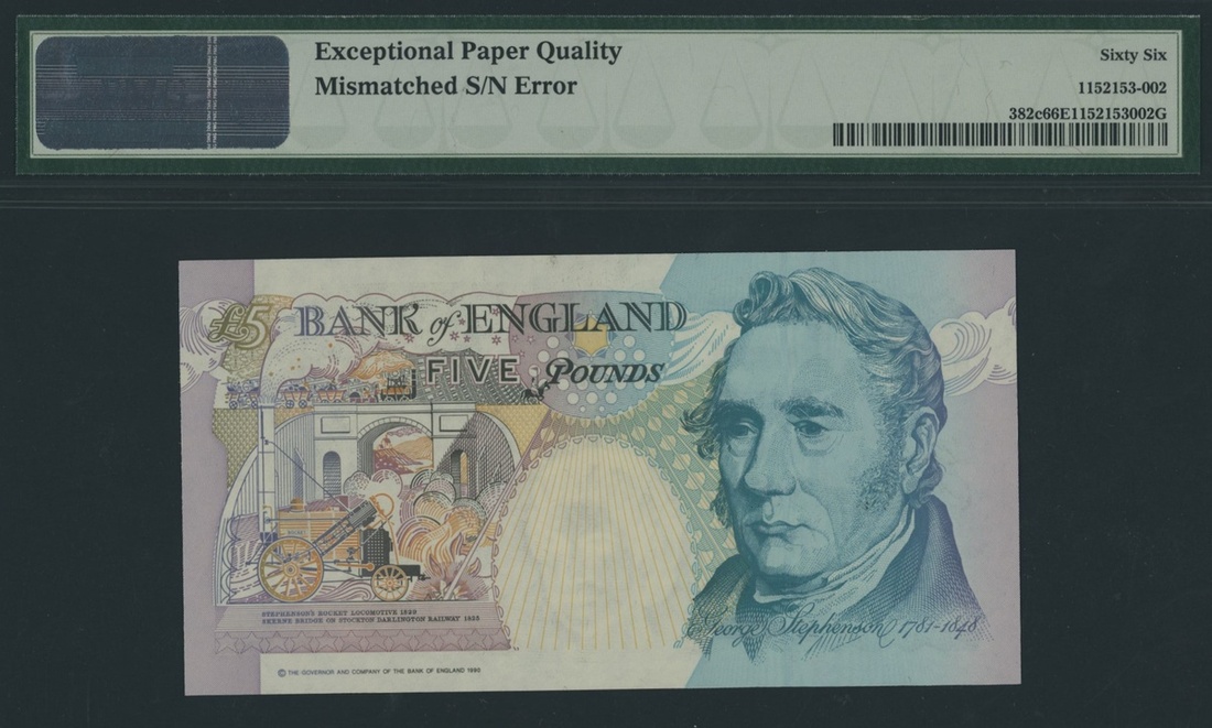 (x) Bank of England, [5 notes] error £5, M. V. Lowther, 1990, consecutive mismatched serial numbers EB61 013773-777/013673-677, (EPM B380), in PMG holders 66 EPQ Gem Uncirculated (5 notes)