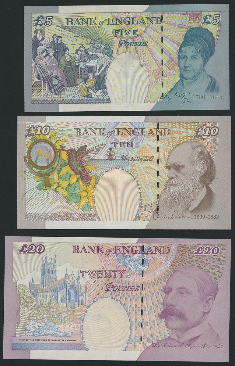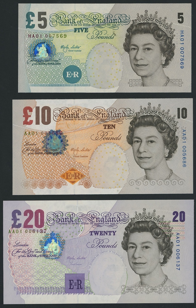 Bank of England, [3 notes] £5, £10, £20, M. V. Lowther, 1999-2002, first run prefixes,