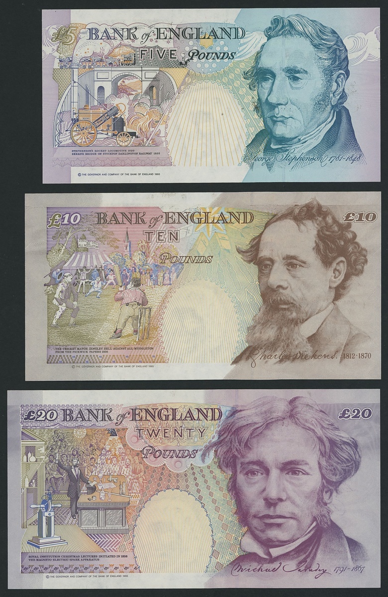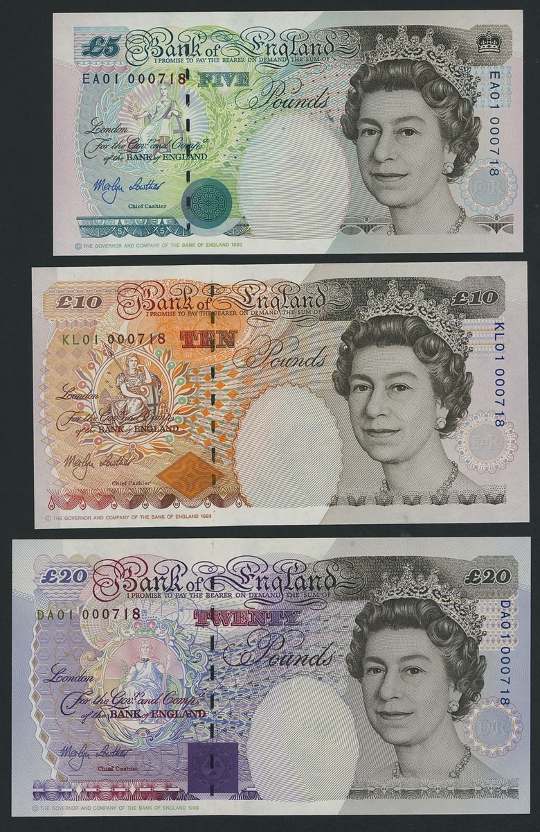 Bank of England, [4 notes] £5, £10, £20, £50, M. V. Lowther, 1999, first run prefixes with matching low serial numbers,