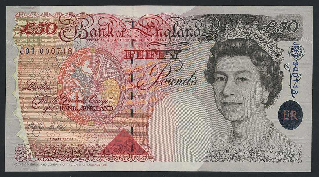 £50, 1999, serial number J01 000718,