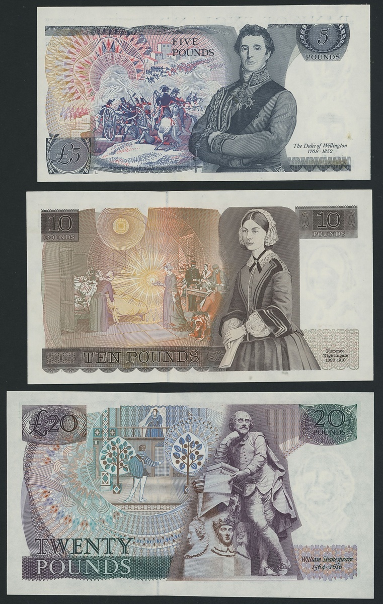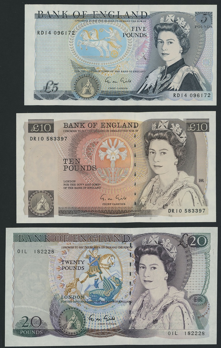 Bank of England, [3 notes] £5, £10, £20, G. M. Gill, 1988, including a first run prefix,