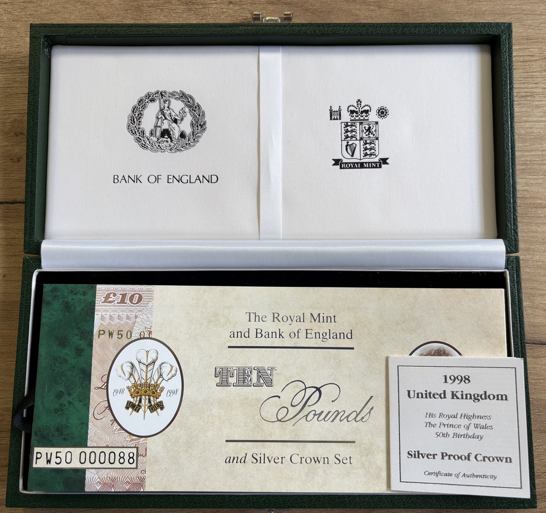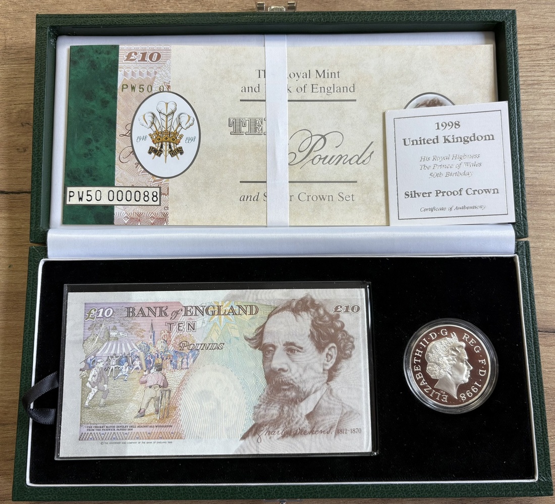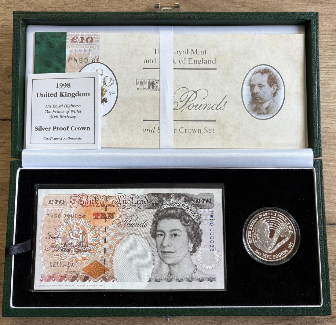Debden Security Printing, Kentfield, £10, 1998, serial number PW50 000088, deep green leather box, also including silver proof £5 crown,