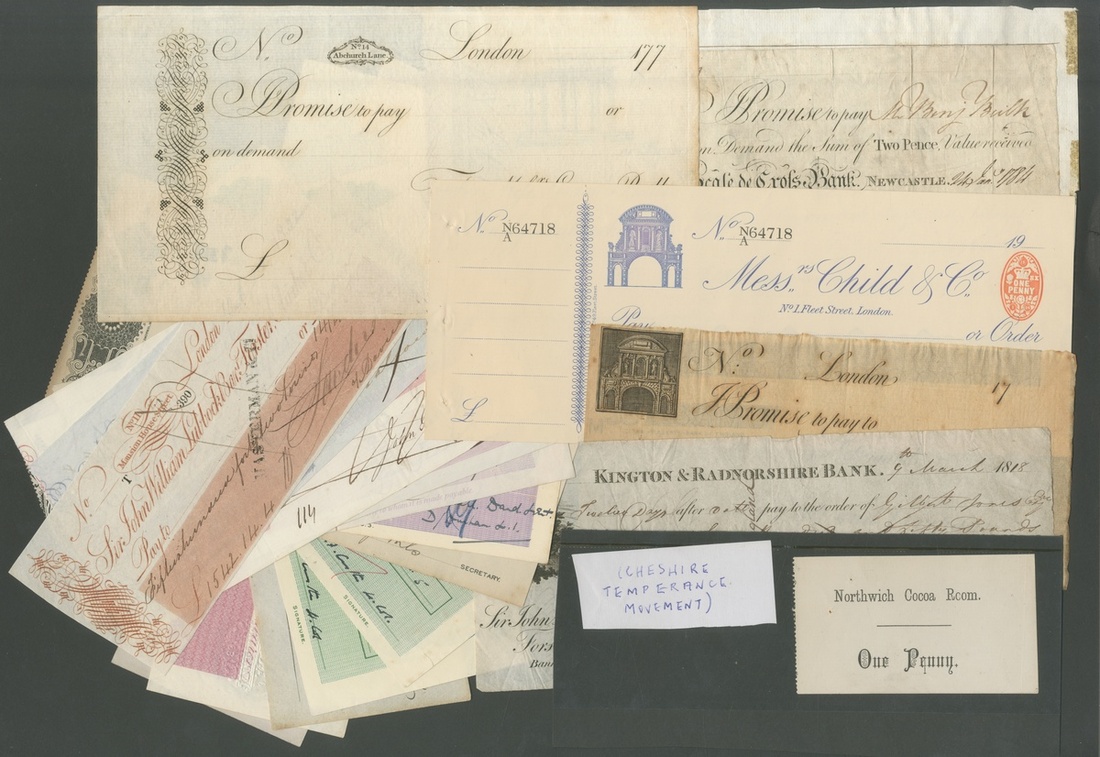 [18 notes] Group of English cheques and 1 Coupon, 1784-1951, cheques issued by various banks, many by Glyn, Mills & Co., some unused, one coupon for Northwich Cocoa Room for 1p, ND,