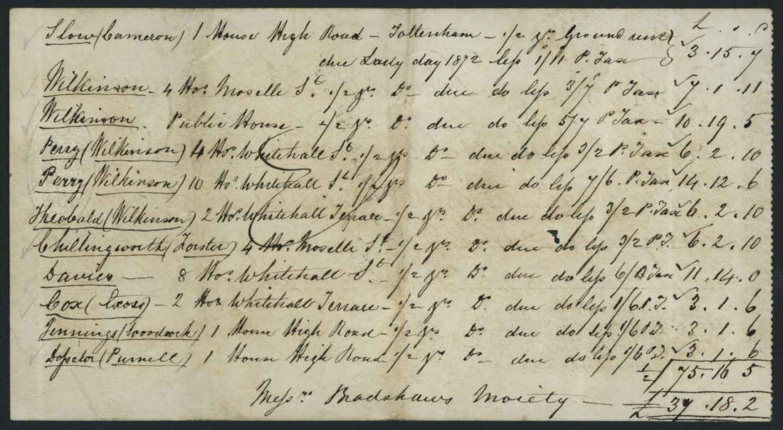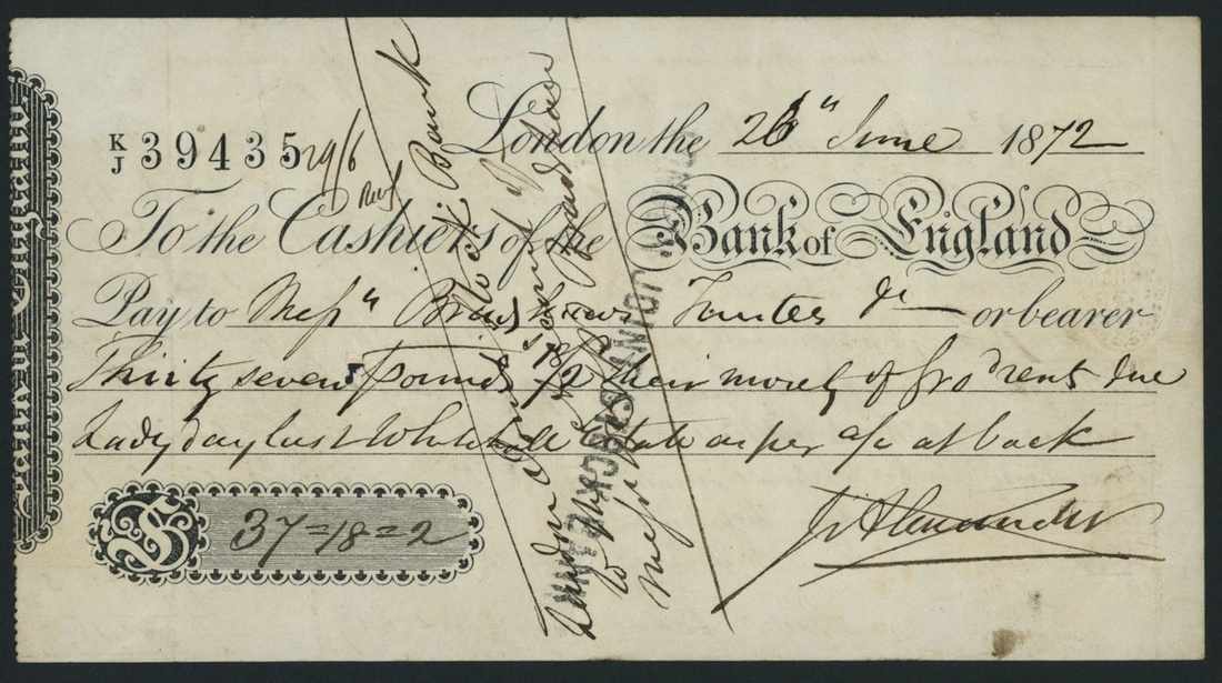 Bank of England Cheque, £37 18/2, London, 26th June 1872, serial number K/J 39435, a cheque for 37 Pounds, 18 Shillings, and 2 Pence. The denomination and stamp of the London Joint Stock Bank are on the obverse. The reverse displays the names, addresses, and payment due dates of each recipient of the cheque.
