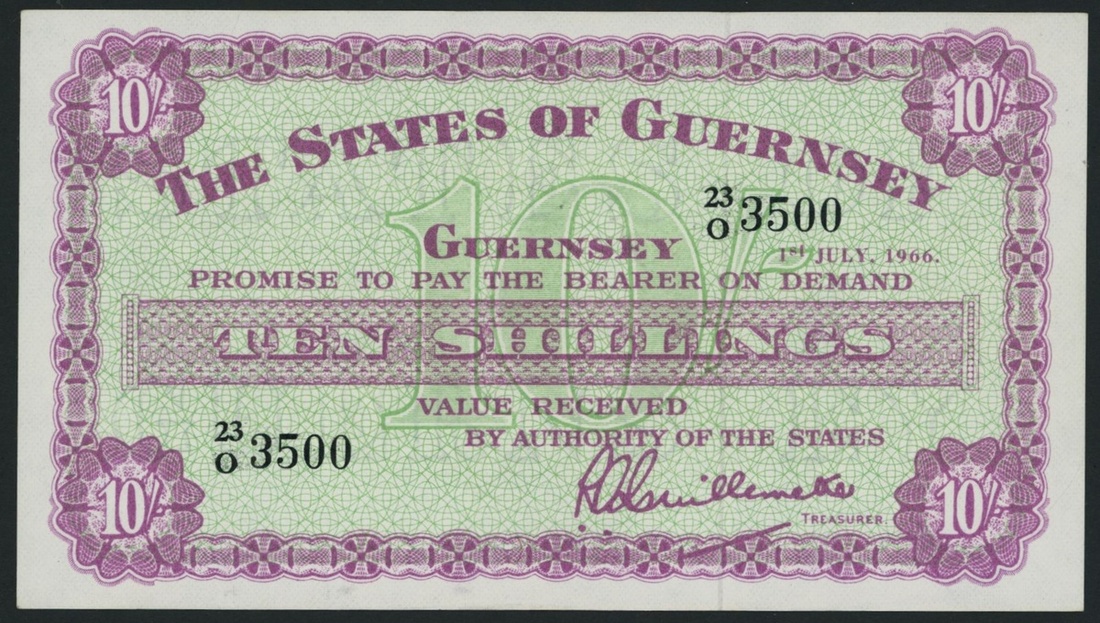 States of Guernsey, 10/- Shillings, 1st of July 1966, serial number 23/O 3500, (Pick 42c, BNB 147q), about uncirculated, last date recorded for the type