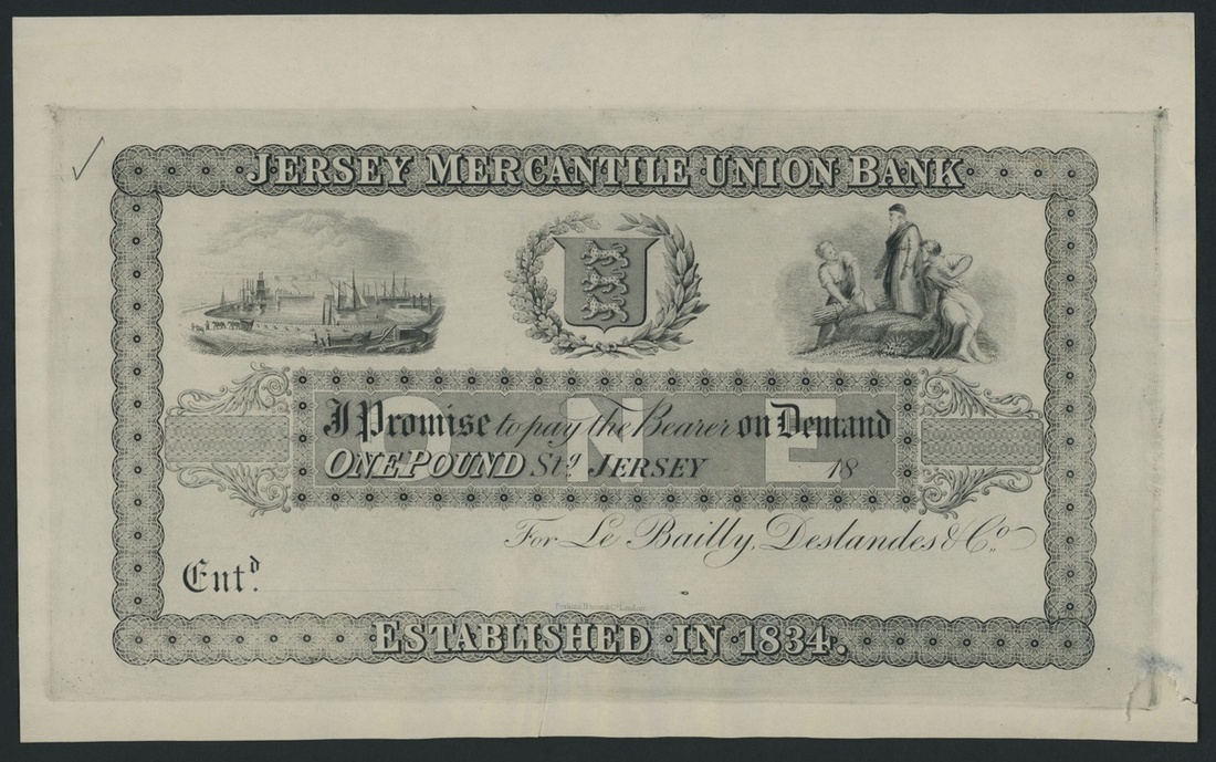 (x) Jersey Mercantile Union Bank, obverse proof £1, Jersey, 18--, for Le Bailly, Deslandes & Co.