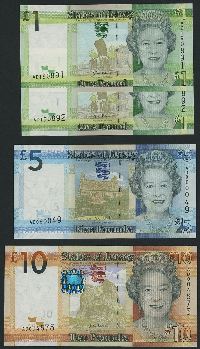 (x) [7 notes] States of Jersey, complete set of 2010 and 2012 issues, £1, £5, £10, £20, £50, £100